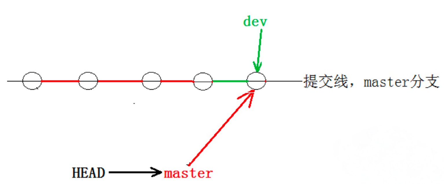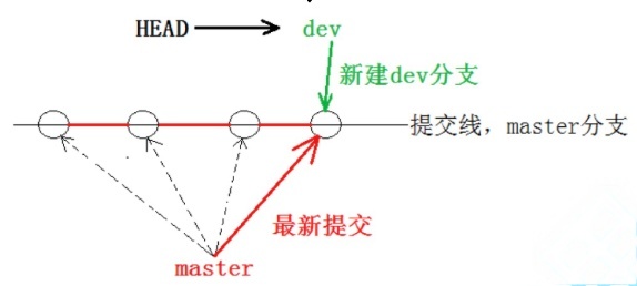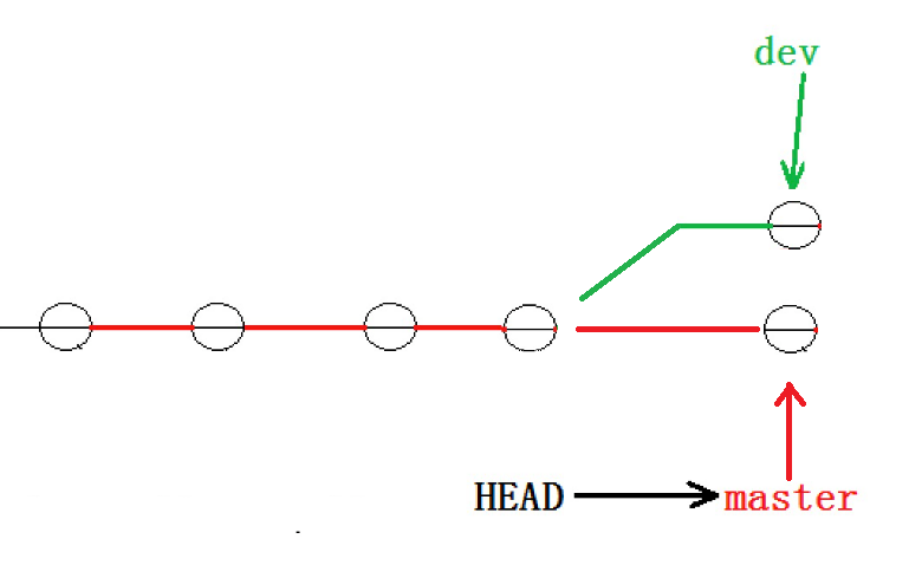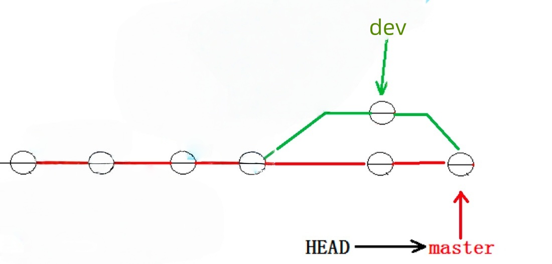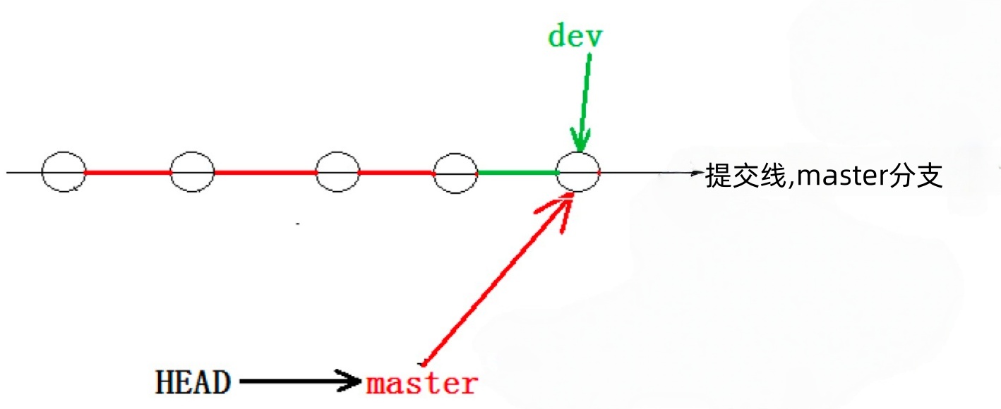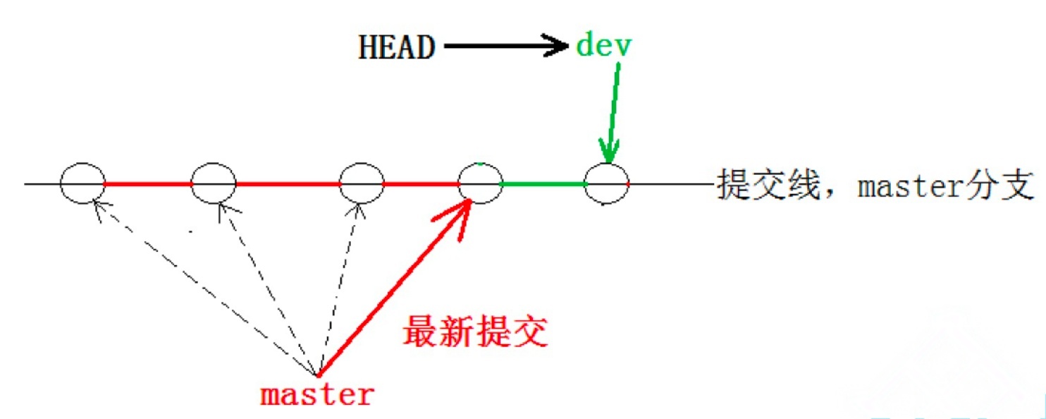 看到这⾥就能明⽩了,因为我们是在dev分⽀上提交的,⽽master分⽀此刻的提交点并没有变,此时的状态如图如下所示: