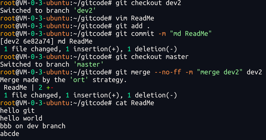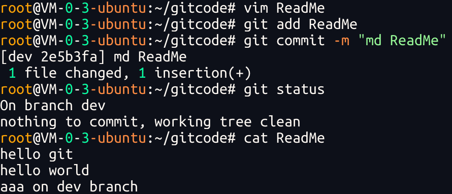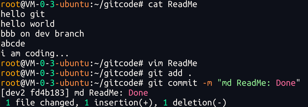 我们发现HEAD已经指向了dev,就表示我们已经成功的切换到了dev上!接下来,在 dev 分⽀下修改 ReadMe⽂件,新增⼀⾏内容,并进⾏⼀次提交操作: