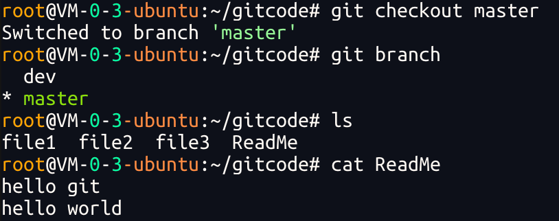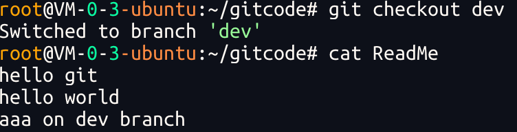 切换回master 分⽀后,发现ReadMe⽂件中新增的内容不⻅了!!!赶紧再切回 dev 看看: