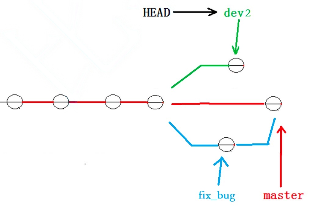 但我们注意到了,修复 bug 的内容,并没有在 dev2 上显示.此时的状态图为:
