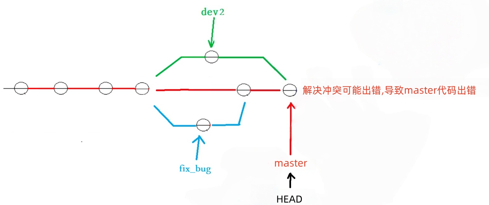 Master 分⽀⽬前最新的提交,是要领先于新建 dev2 时基于的 master 分⽀的提交的,所以我们在dev2中当然看不⻅修复 bug 的相关代码.我们的最终⽬的是要让 master 合并 dev2 分⽀的,那么正常情况下我们切回 master 分⽀直接合并即可,但这样其实是有⼀定⻛险的.是因为在合并分⽀时可能会有冲突,⽽代码冲突需要我们⼿动解决(在 master上解决).我们⽆法保证对于冲突问题可以正确地⼀次性解决掉,因为在实际的项⽬中,代码冲突不只⼀两⾏那么简单,有可能⼏⼗上百⾏,甚⾄更多,解决的过程中难免⼿误出错,导致错误的代码被合并到 master上.此时的状态为: