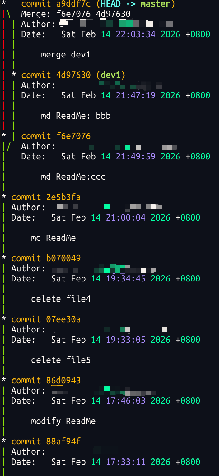 那么这就不是 Fast forward 模式了,这样的好处是,从分⽀历史上就可以看出分⽀信息.例如我们现在已经删除了在合并冲突部分创建的dev1 分⽀,但依旧能看到 master 其实是由其他分⽀合并得到: