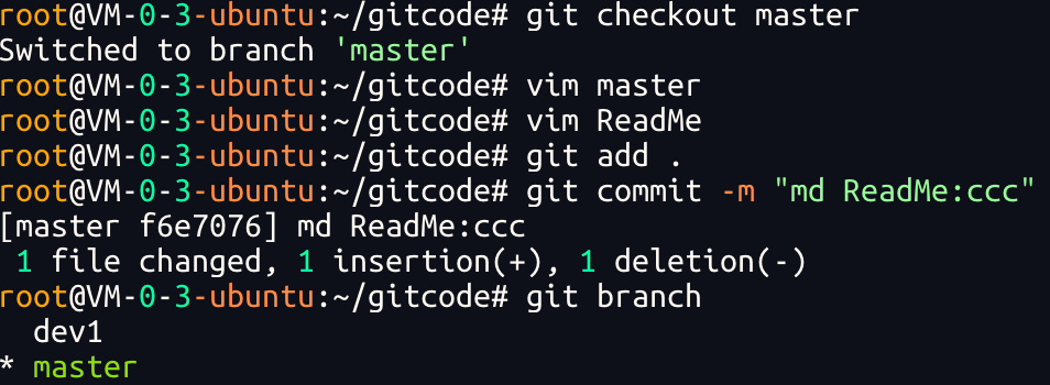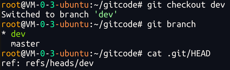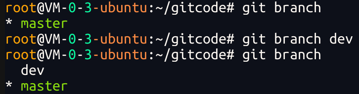 Git ⽀持我们查看或创建其他分⽀,在这⾥我们来创建第⼀个⾃⼰的分⽀dev ,对应的命令为: