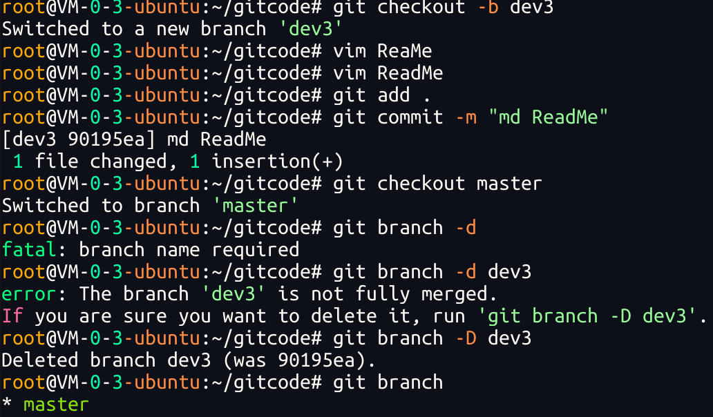 合并完成后,dev 分⽀对于我们来说就没⽤了,那么dev分⽀就可以被删除掉,注意如果当前正处于某分⽀下,就不能删除当前分⽀,如: