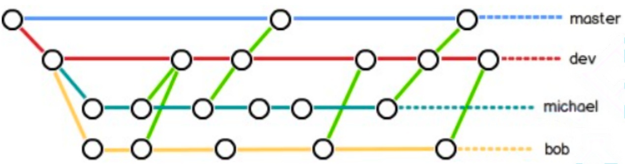 那在哪⼲活呢?⼲活都在dev分⽀上,也就是说,dev分⽀是不稳定的,到某个时候,⽐如1.0版本发布时,再把dev分⽀合并到master上,在master分⽀发布1.0版本;你和你的⼩伙伴们每个⼈都在dev分⽀上⼲活,每个⼈都有⾃⼰的分⽀,时不时地往dev分⽀上合并就可以了.所以,团队合作的分⽀看起来就像这样: