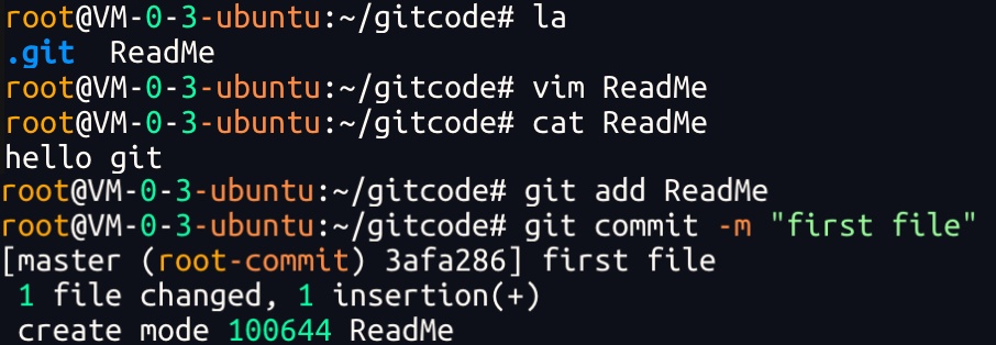 git commit 命令执⾏成功后会告诉我们,1个⽂件被改动(就是我们新添加的ReadMe⽂件),插⼊了一⾏内容(ReadMe有一⾏内容).