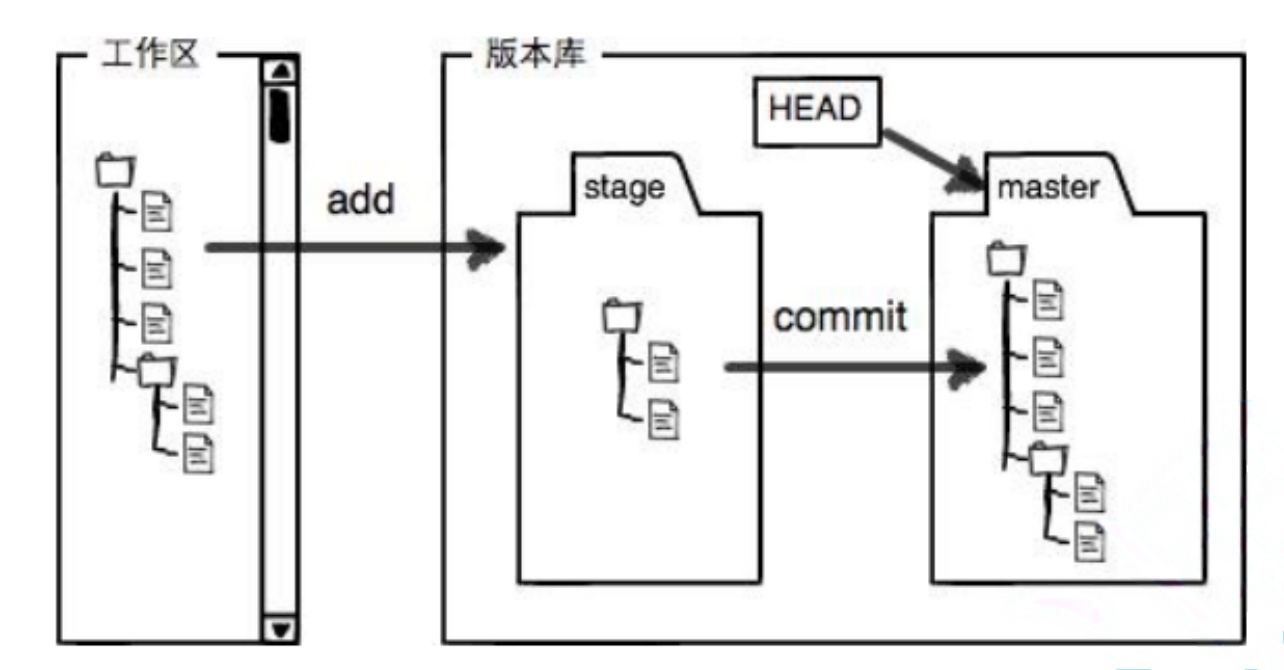 下⾯这个图展⽰了⼯作区、暂存区和版本库之间的关系: