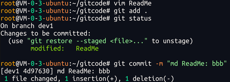 注意:git commit 后⾯的 -m 选项,要跟上描述本次提交的 message,由⽤⼾⾃⼰完成,这部分内容绝对不能省略,并要好好描述,是⽤来记录你的提交细节,是给我们⼈看的.