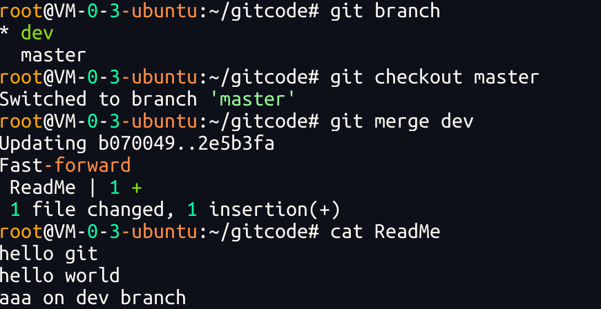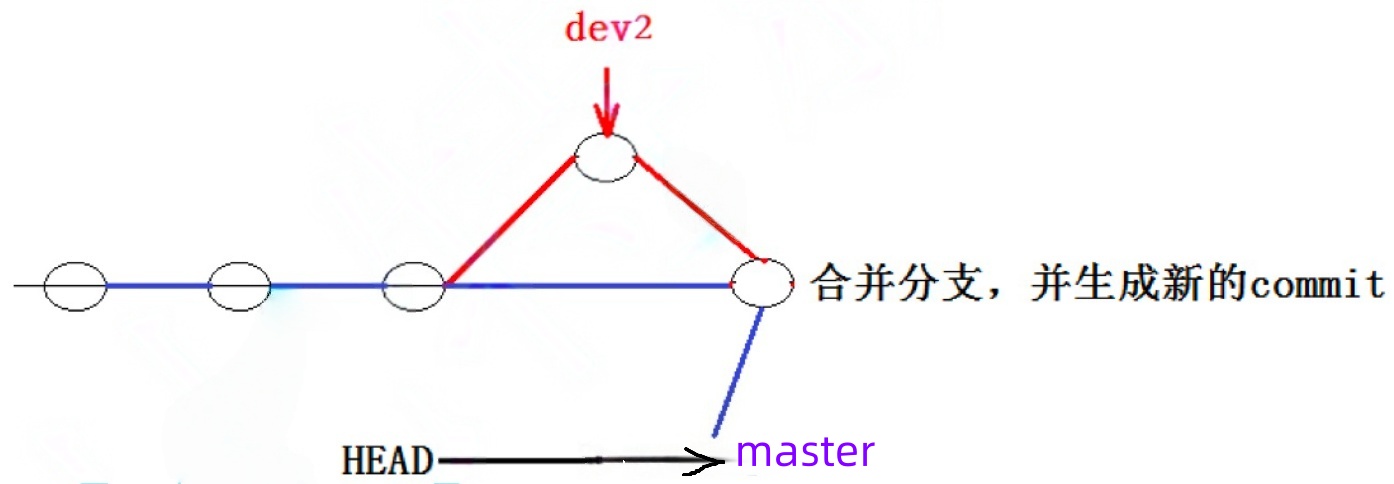 git merge命令⽤于合并指定分⽀到当前分⽀.合并后,master 就能看到 dev 分⽀提交的内容了.此时的状态如图如下所示: