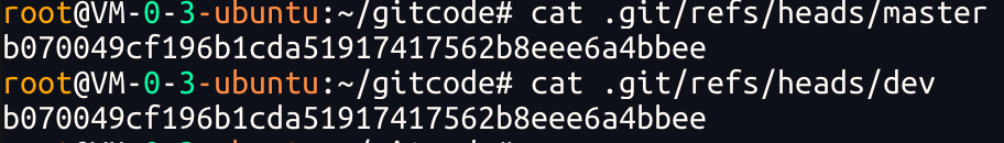 发现⽬前dev和master指向同⼀个修改.并且也可以验证下 HEAD ⽬前是指向master的.