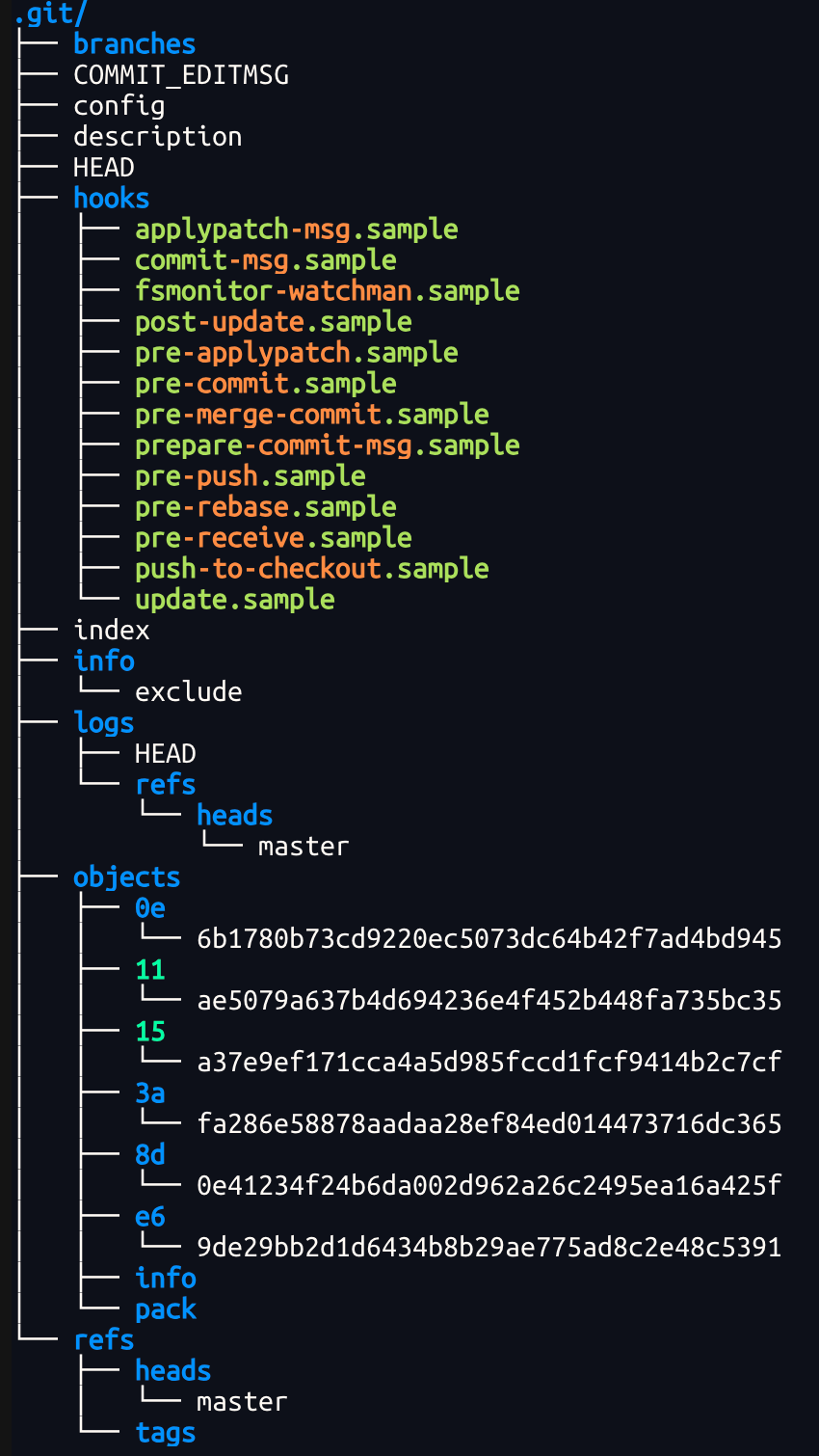 我们发现,当前⽬录下多了⼀个.git 的隐藏⽂件,.git ⽬录是Git 来跟踪管理仓库的,不要⼿动修改这个⽬录⾥⾯的⽂件,不然改乱了,就把 Git 仓库给破坏了.其中包含Git 仓库的诸多细节,我们可以打开看看.