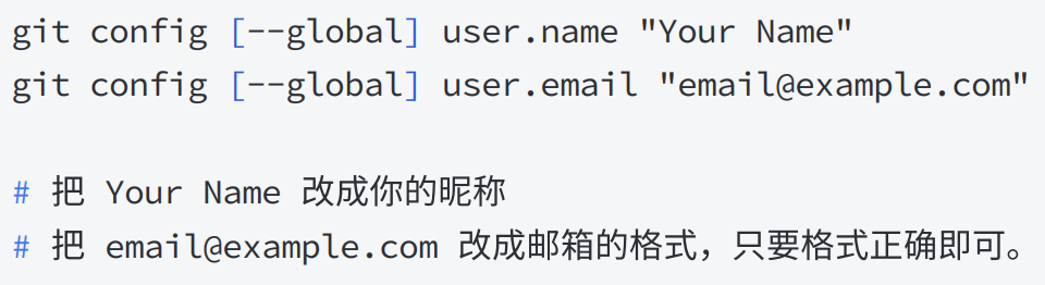 当安装Git后⾸先要做的事情是设置你的⽤⼾名称和 e-mail 地址,这是⾮常重要的.配置命令为: