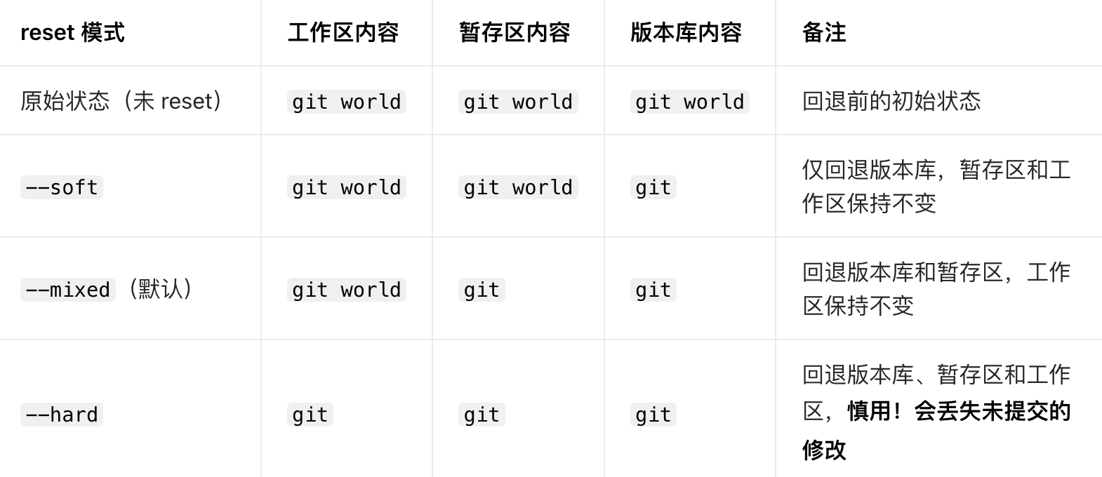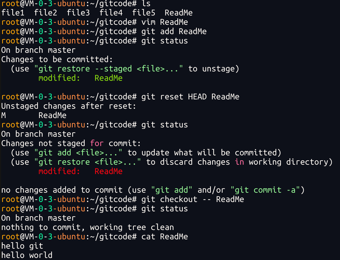 让我们来回忆⼀下学过的 git reset 回退命令,该命令如果使⽤ --mixed 参数,可以将暂存区的内容退回为指定的版本内容,但⼯作区⽂件保持不变.那我们就可以回退下暂存区的内容了!!!⽤ git status 查看⼀下,发现现在暂存区是⼲净的,⼯作区有修改.如何丢弃⼯作区的修改吗?