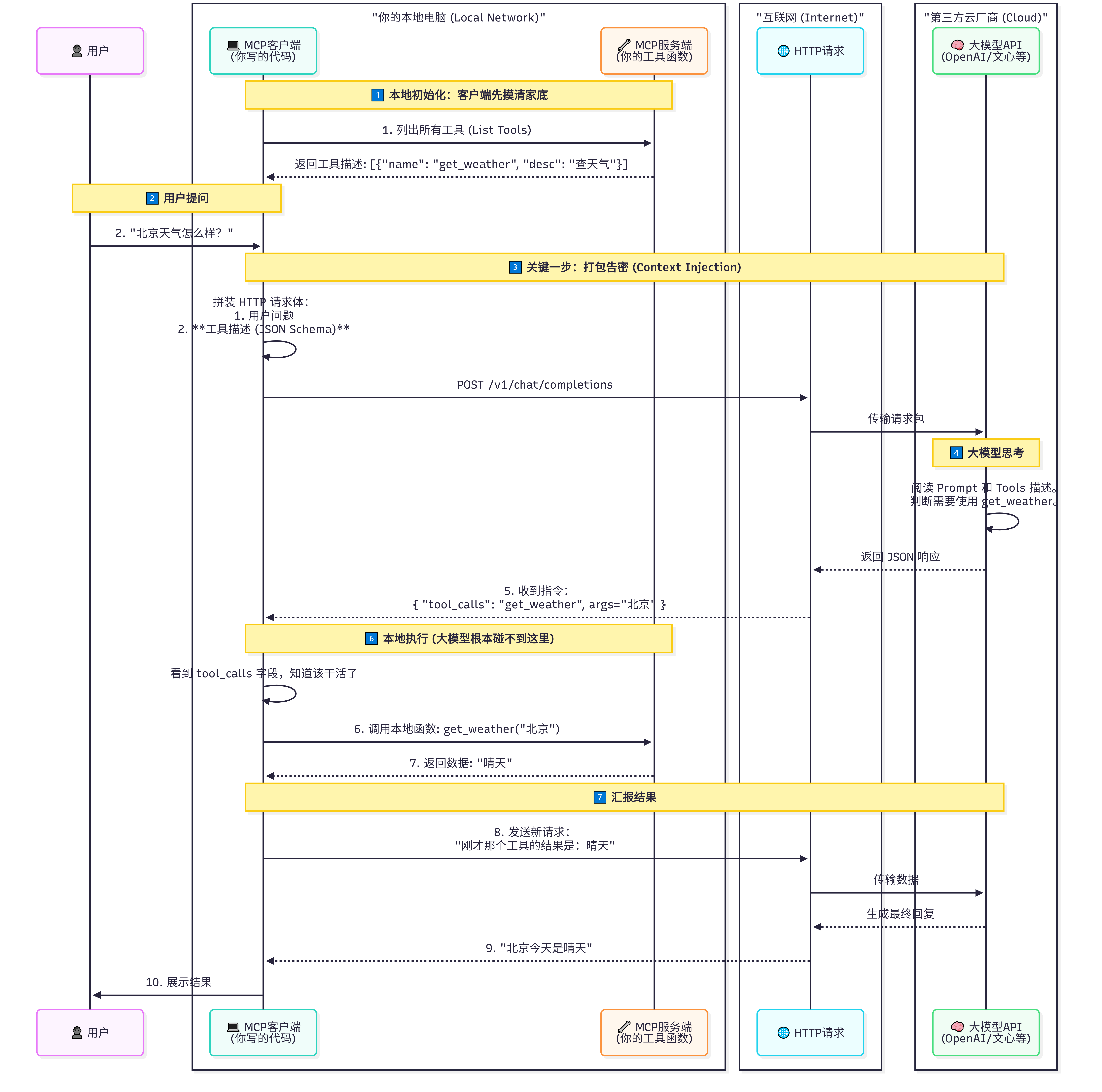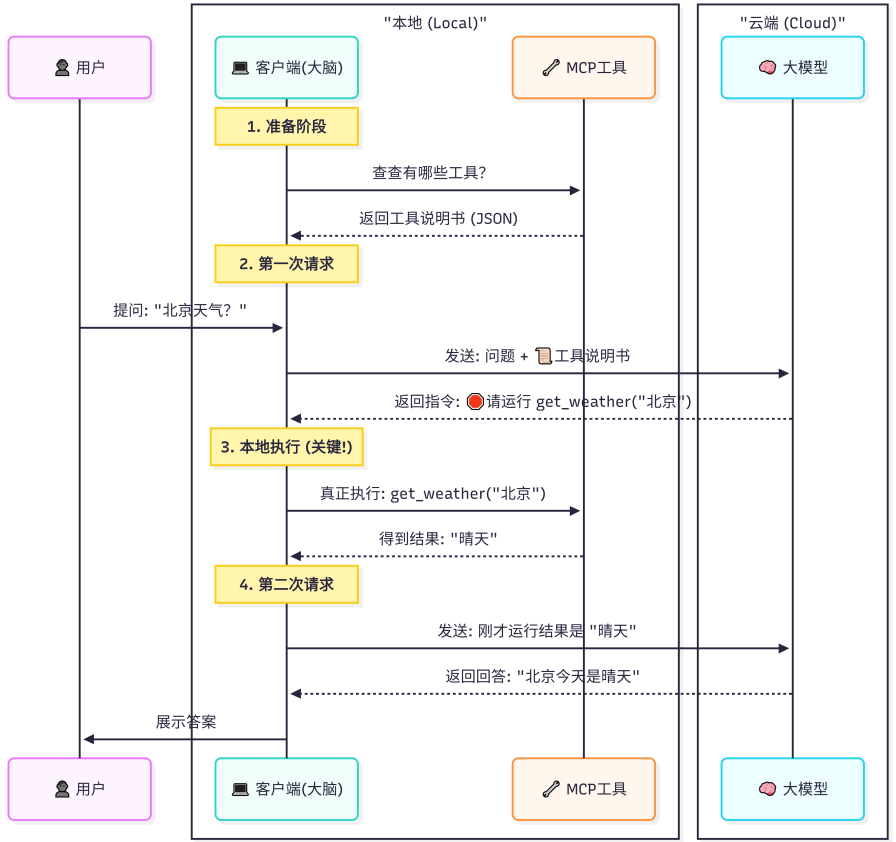这不仅仅是"告诉"模型,而是每一次请求,都要把你的"家底"(工具定义)通过互联网发送给大模型。