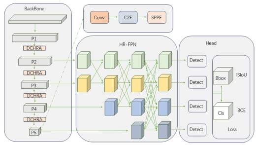 - 骨干 (Backbone):采用 CSPNet/CSPDarknet 进阶版本,结合深度可分离卷积,提取低层次纹理与高层次语义的多尺度特征,兼顾计算效率与特征表达能力;