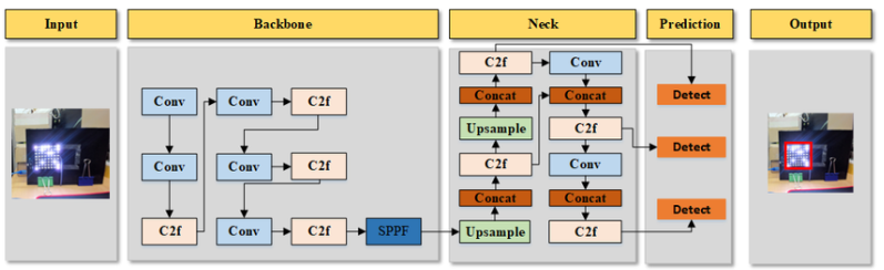 YOLOv8 延续 YOLO 系列端到端 CNN 框架,由骨干、颈部、头部 三大核心模块组成,核心创新为无锚框检测,各模块设计如下: