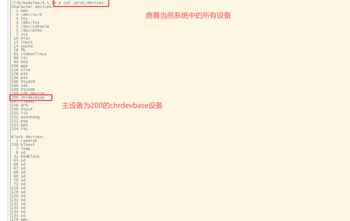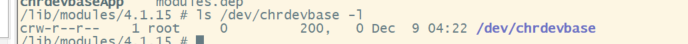 当前系统存在 chrdevbase 这个设备,主设备号为 200,跟我们设置的主设备号一致。
