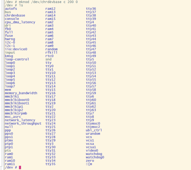 驱动加载成功需要在/dev 目录下创建一个与之对应的设备节点文件,应用程序就是通过操作这个设备节点文件来完成对具体设备的操作。输入如下命令创建/dev/chrdevbase 这个设备节点文件: