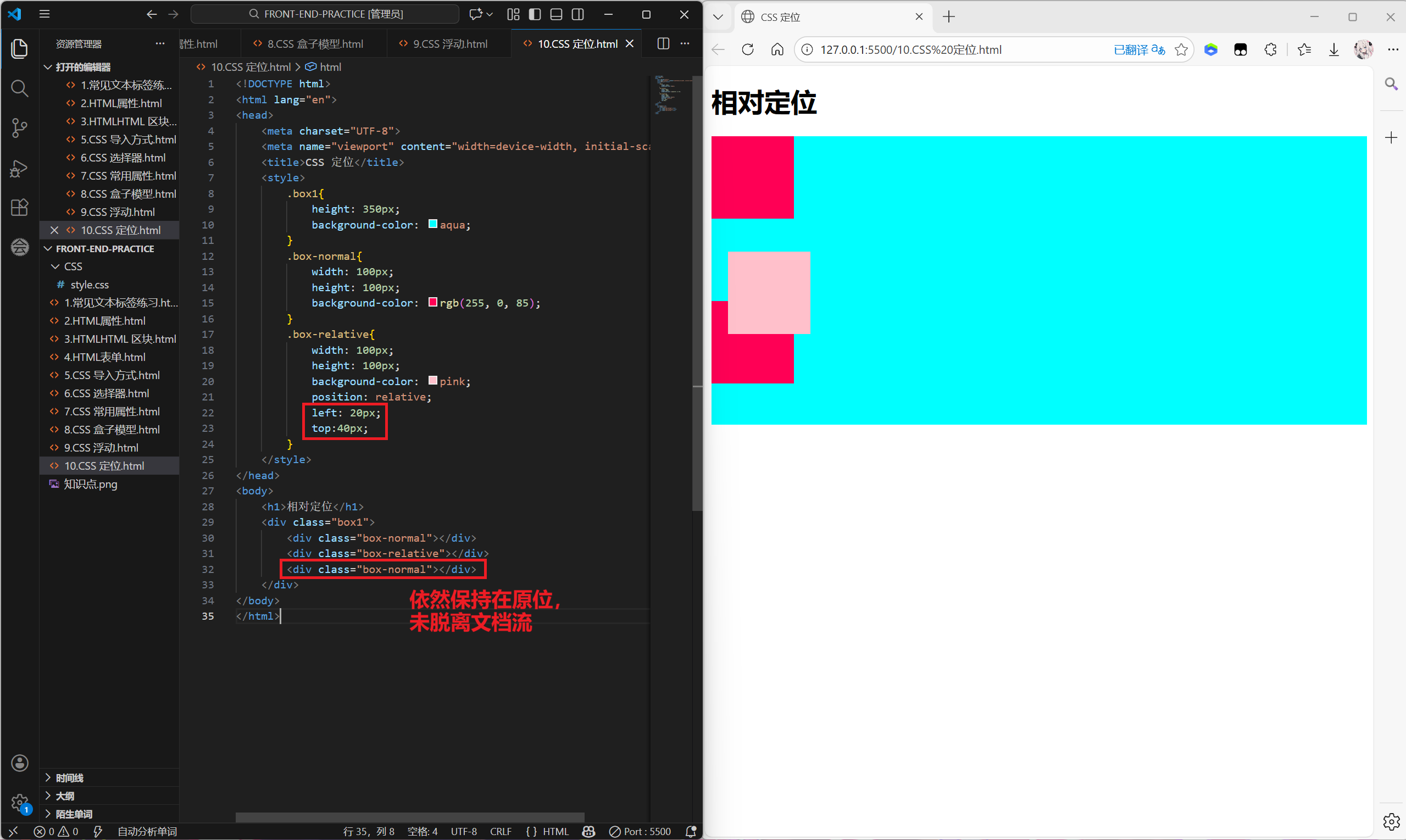| 相对定位 (relative) | 元素在文档流中的正常位置 | 不脱离 | 保留原位置,仅视觉偏移 | 微调位置、做绝对定位的父容器 |