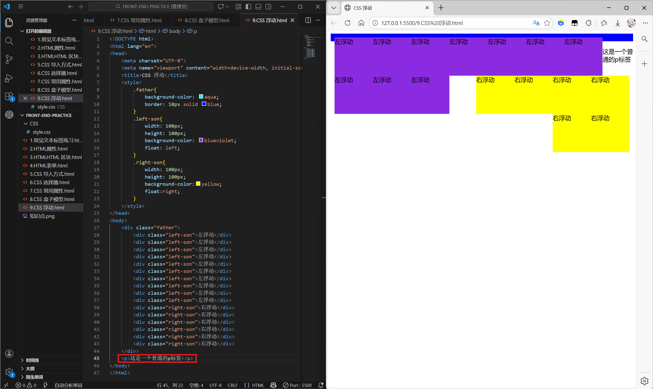 一句话总结就是浮动就是让元素 "飘起来",不再占原来的位置,还能让块级元素并排显示。浮动最典型的应用就是让多个块级元素在同一行内排列显示。