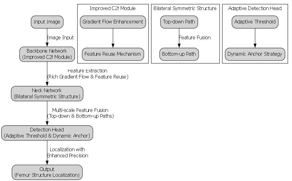 骨干网络采用改进的C2f模块,通过更丰富的梯度流和特征重用机制,增强模型对股骨细微特征的提取能力。颈部网络引入了双边对称结构,同时结合了自顶向下和自底向上的特征路径,实现多尺度特征的充分融合。检测头部分则针对医学图像的特点,采用自适应阈值和动态锚框策略,提升模型对股骨结构的定位精度。