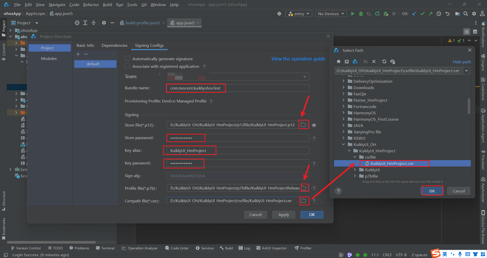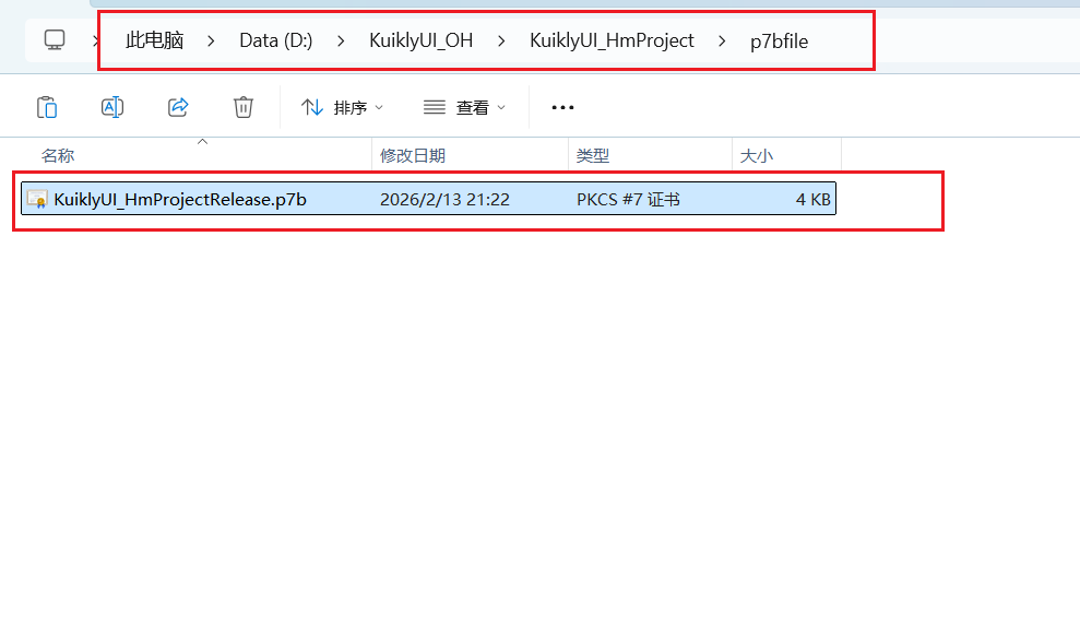 p7bfile文件夹中的KuiklyUI_HmProjectRelease.p7b。 - Certpath file :选择