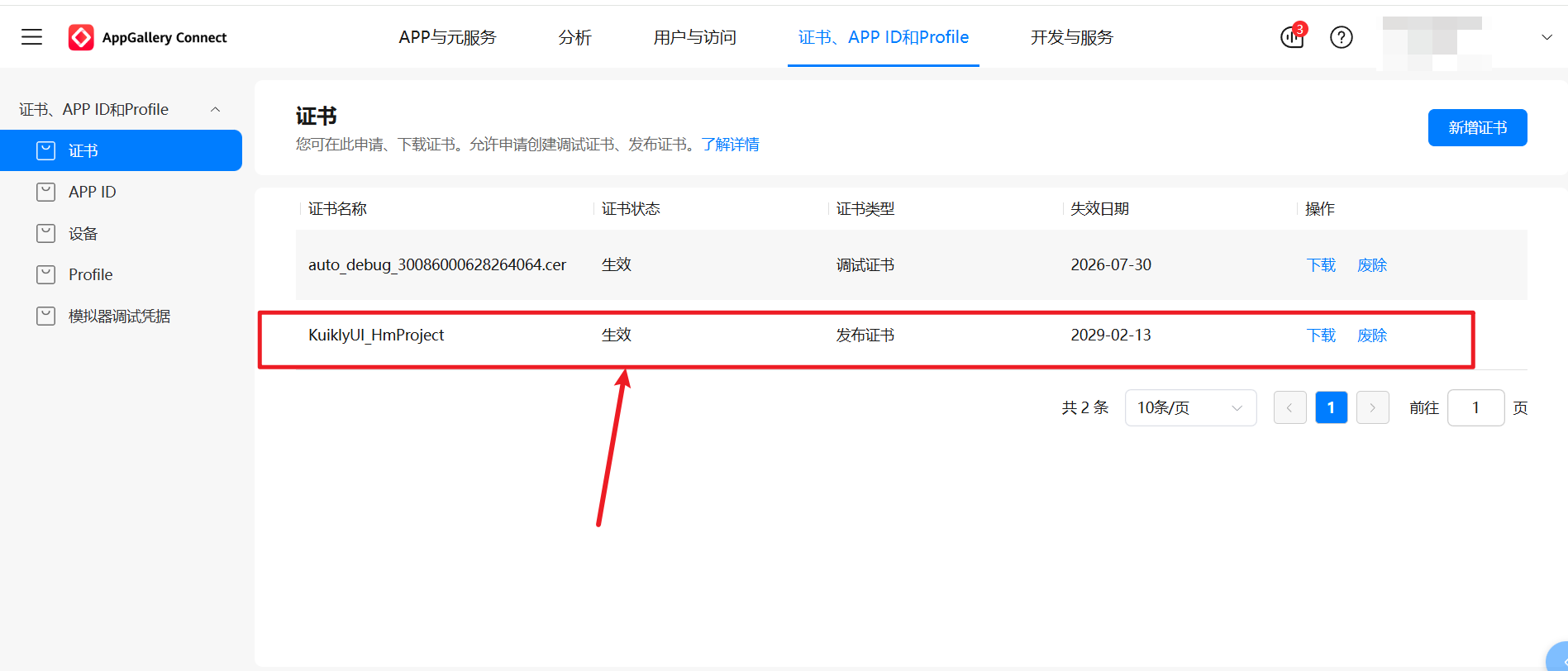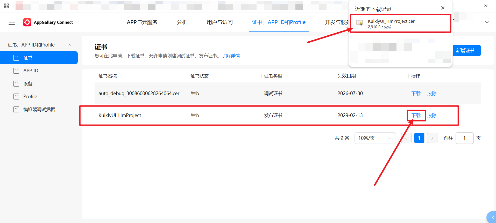 提交,证书生效后,点击下载获取KuiklyUI_HmProject.cer证书文件,保存至csrfile文件夹中。