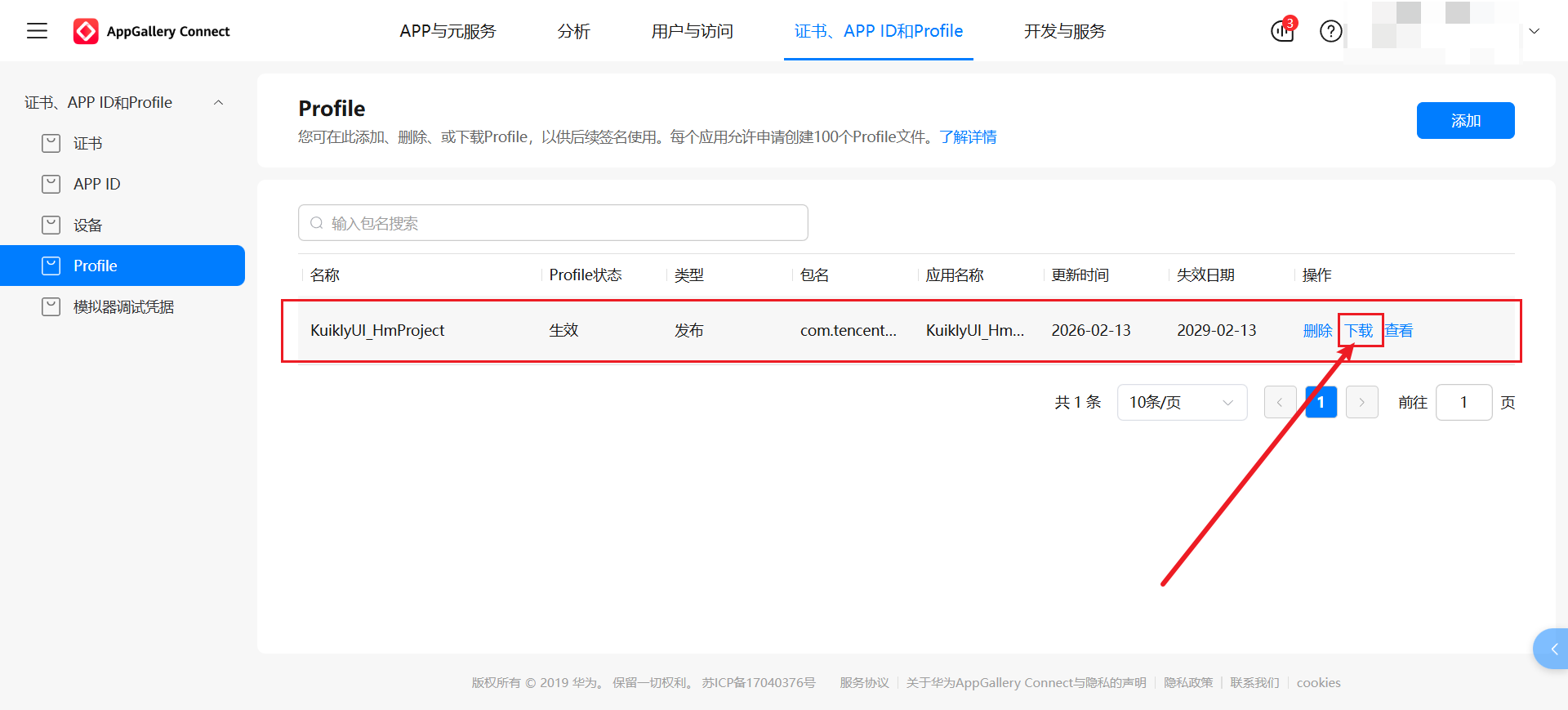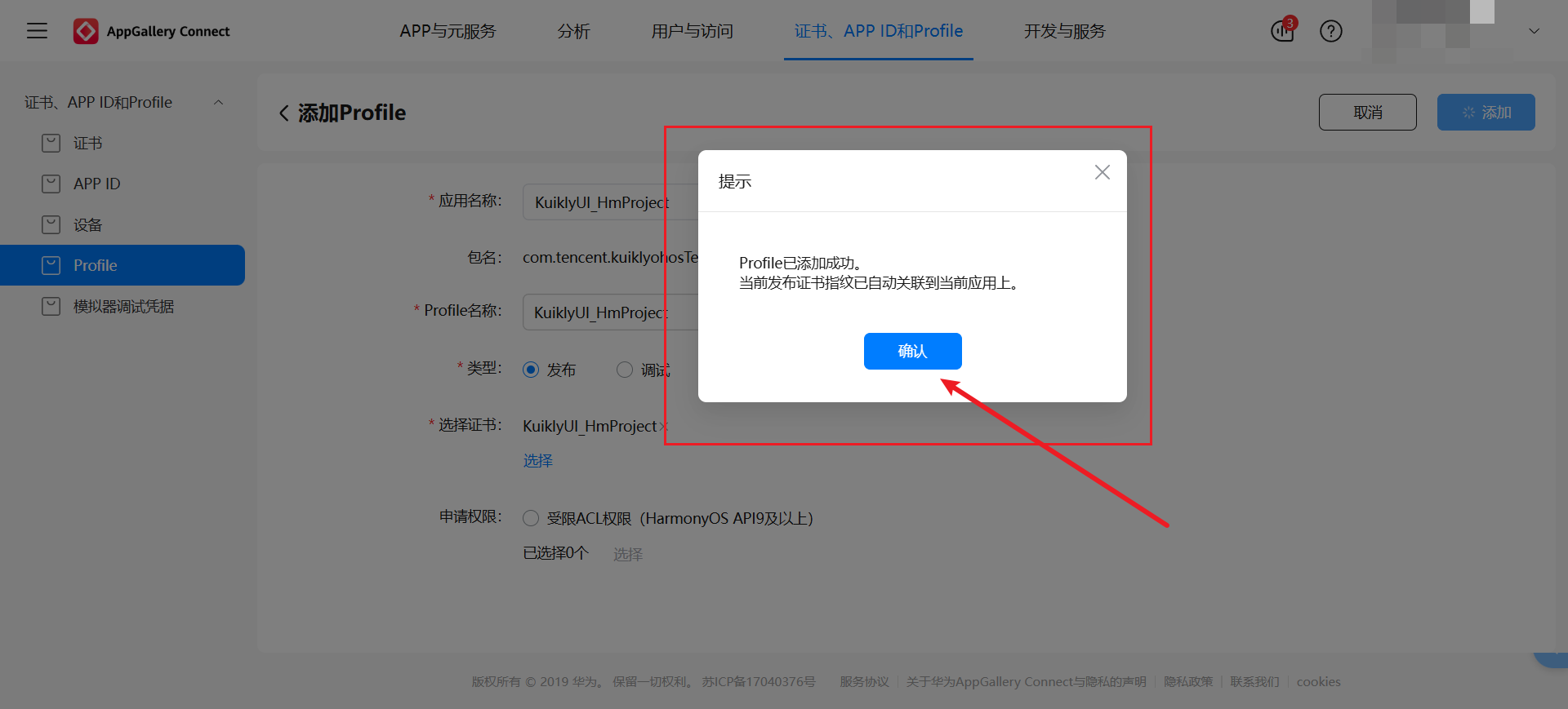 添加,Profile 生效后,点击下载获取KuiklyUI_HmProjectRelease.p7b文件,保存至项目根目录下新建的p7bfile文件夹中。