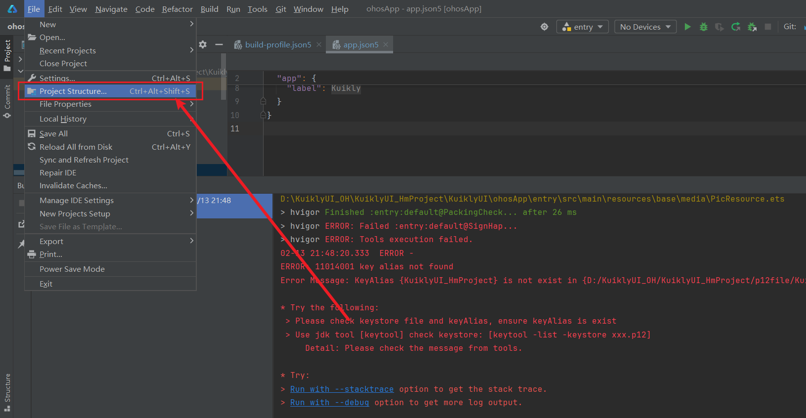 Key alias not found错误,可通过keytool -list -keystore KuiklyUI_HmProject.p12命令查看到真实别名(如kuiklyui),并在此处填写。