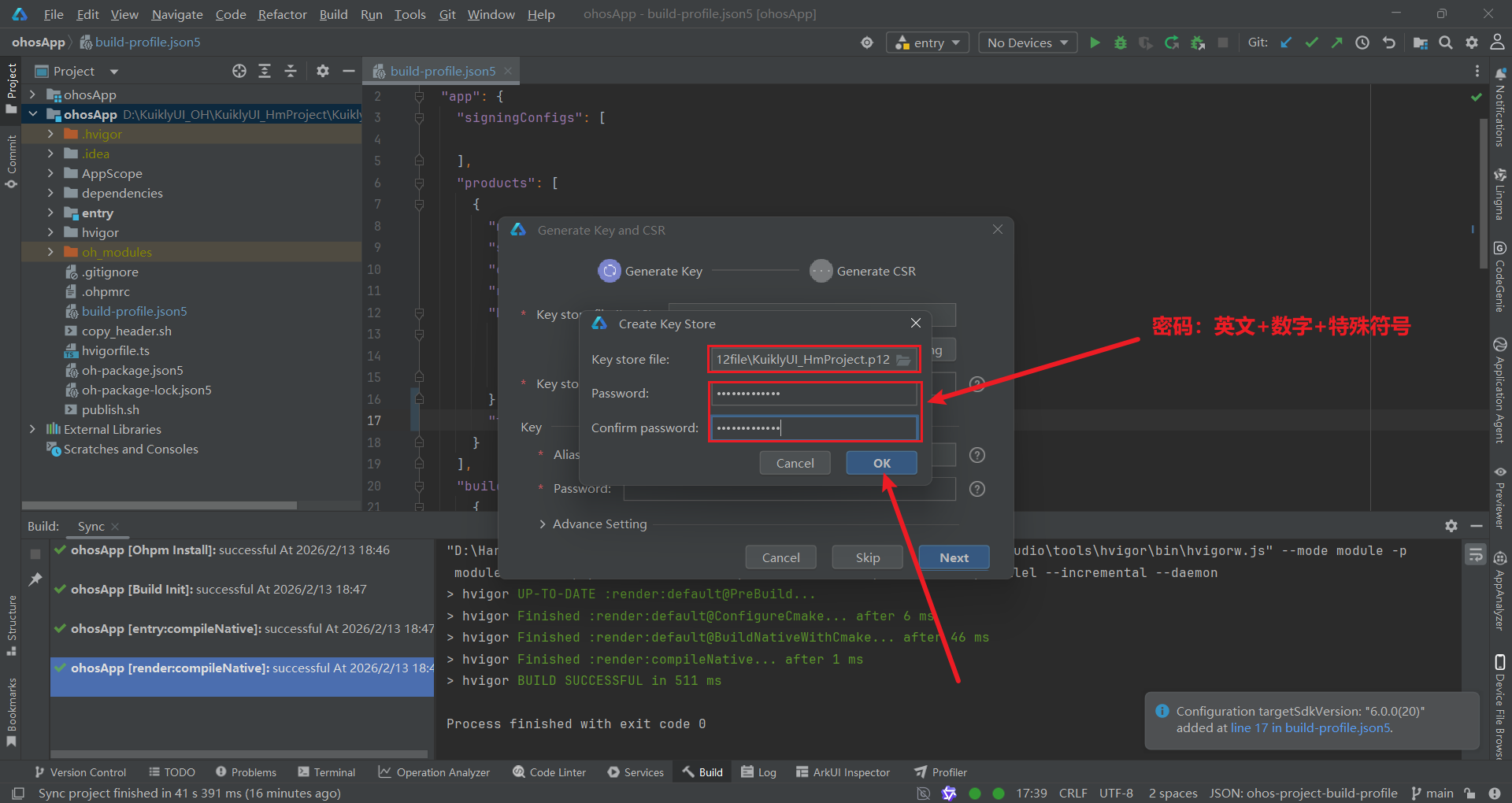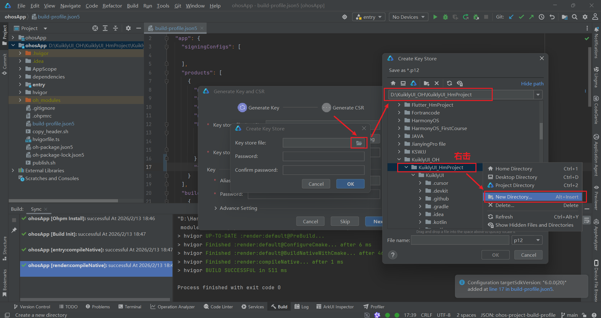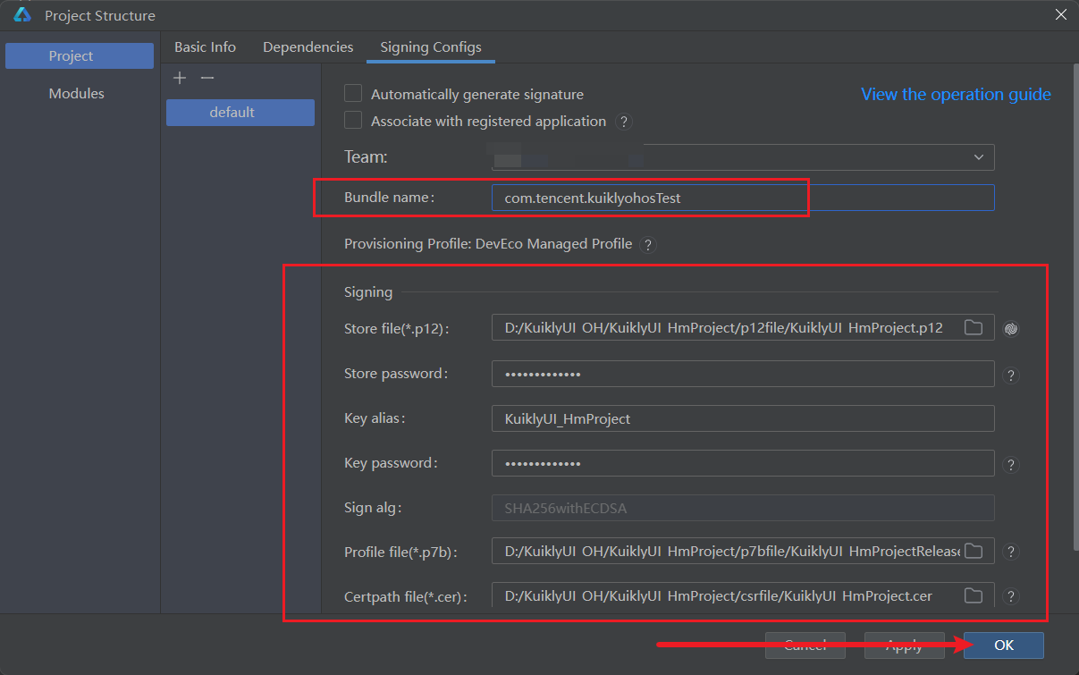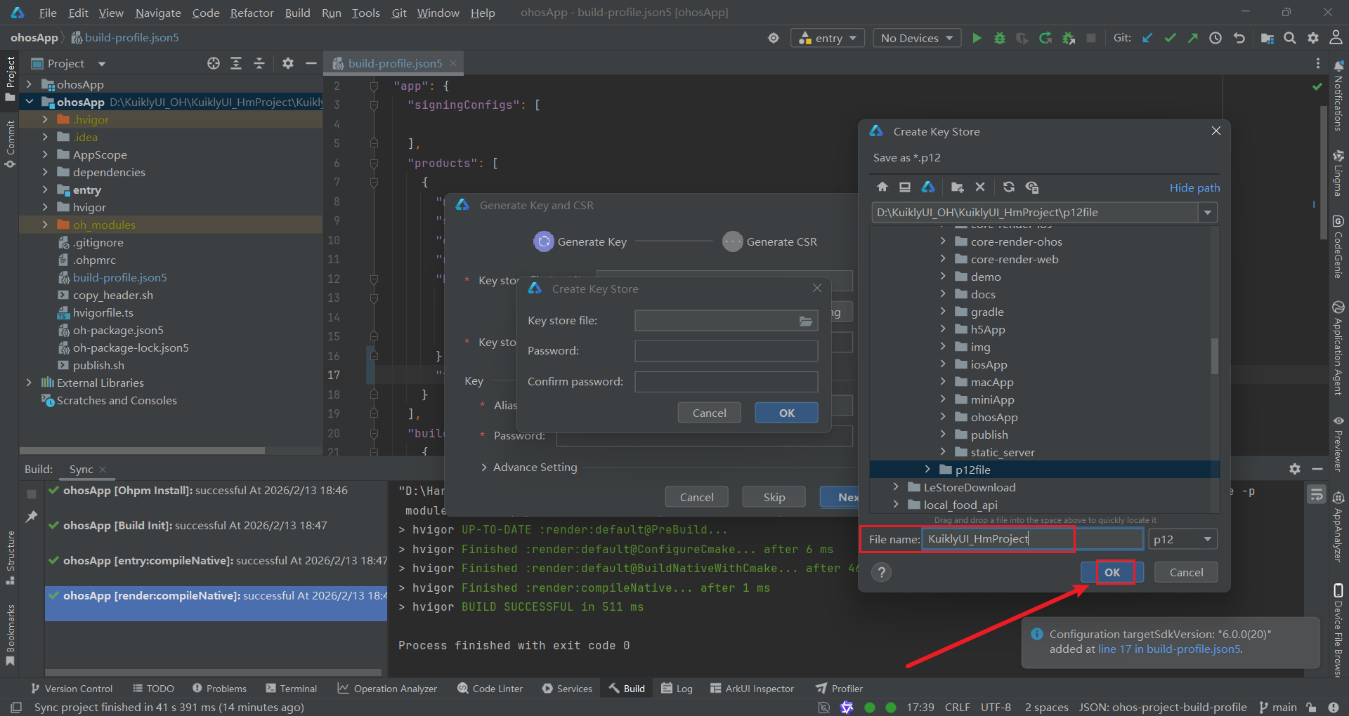 p12file文件夹中的KuiklyUI_HmProject.p12。 - Store password:输入之前设置的密钥库密码。