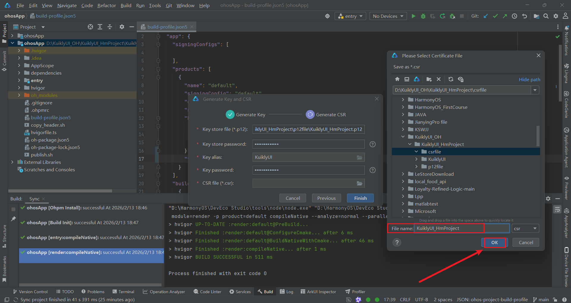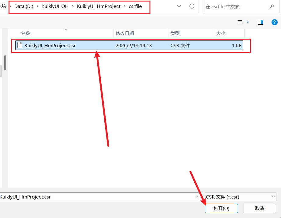 csrfile文件夹,将文件命名为KuiklyUI_HmProject.csr,点击OK。