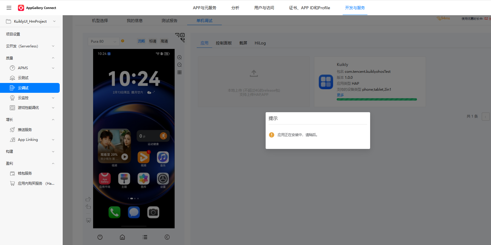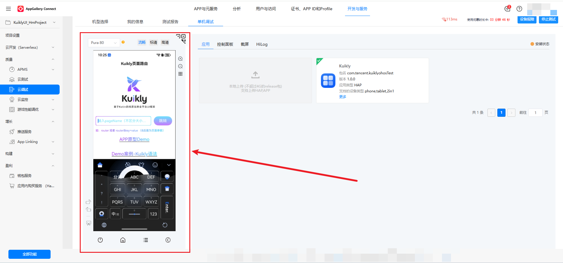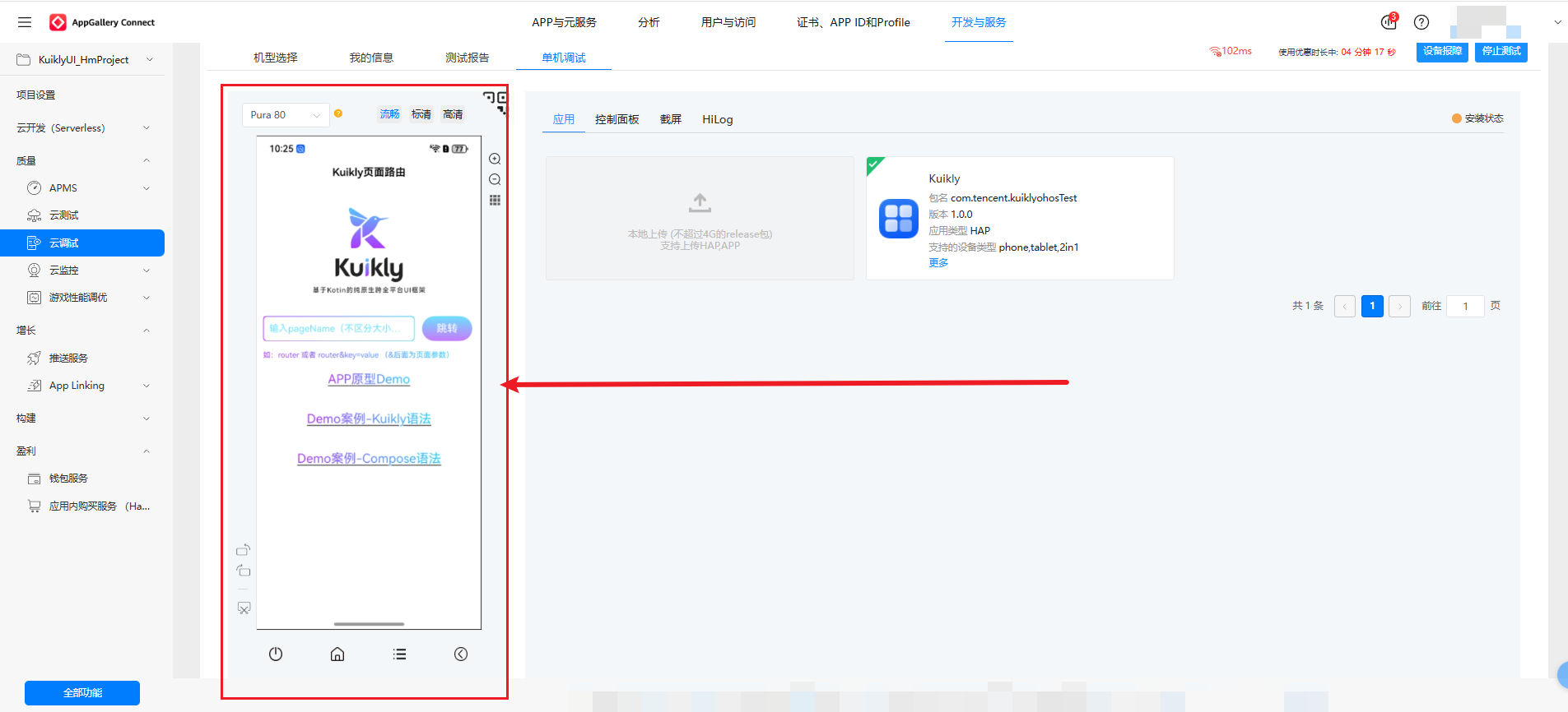 **AppGallery Connect 云真机部署与运行验证:**借助华为云调试服务,我们将构建好的 HAP 包部署到云真机上,完成了应用的安装、运行与功能验证,确保 Kuikly 应用在真实鸿蒙设备上的稳定性与兼容性。