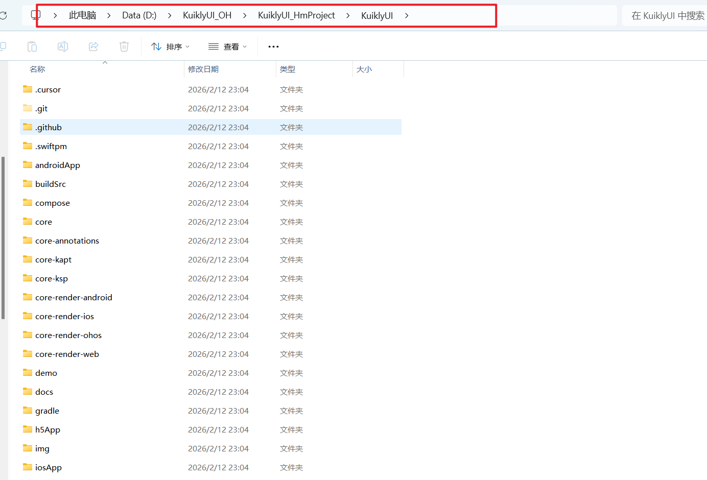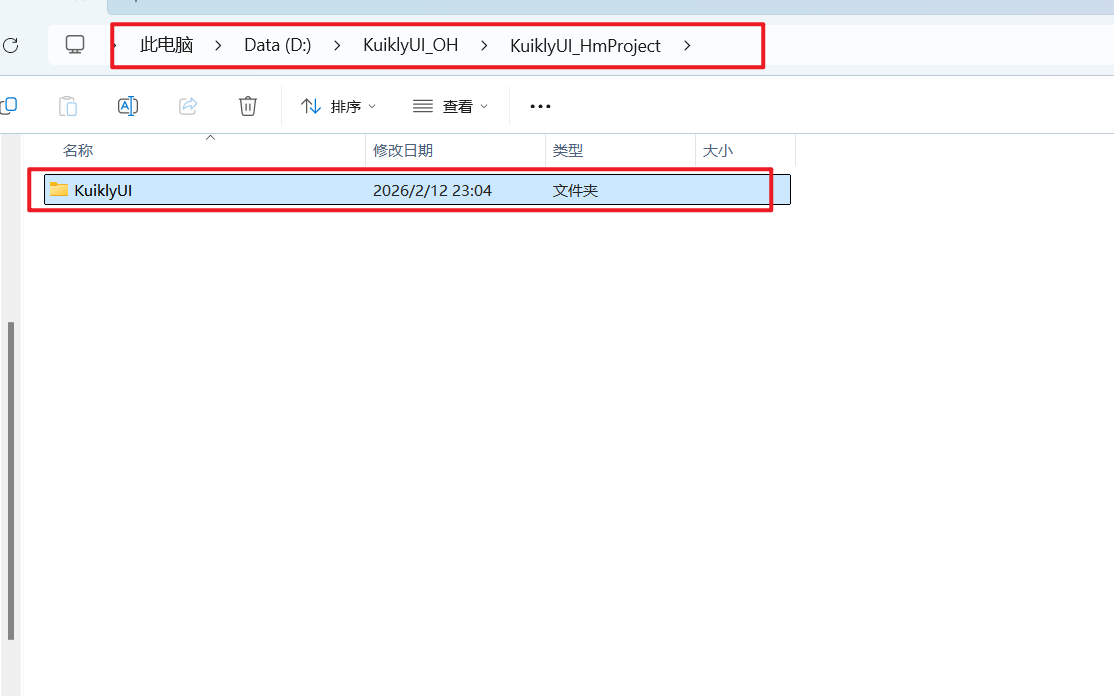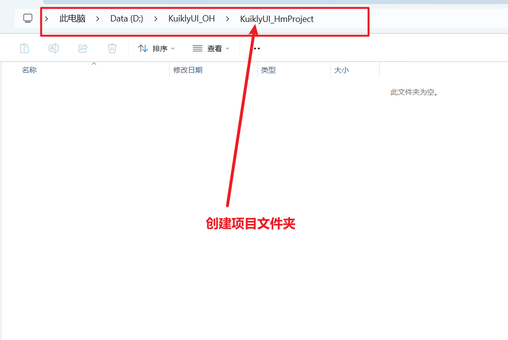 本文中我在 D 盘根目录下创建总文件夹 KuiklyUI_OH,作为所有跨平台项目的根目录。