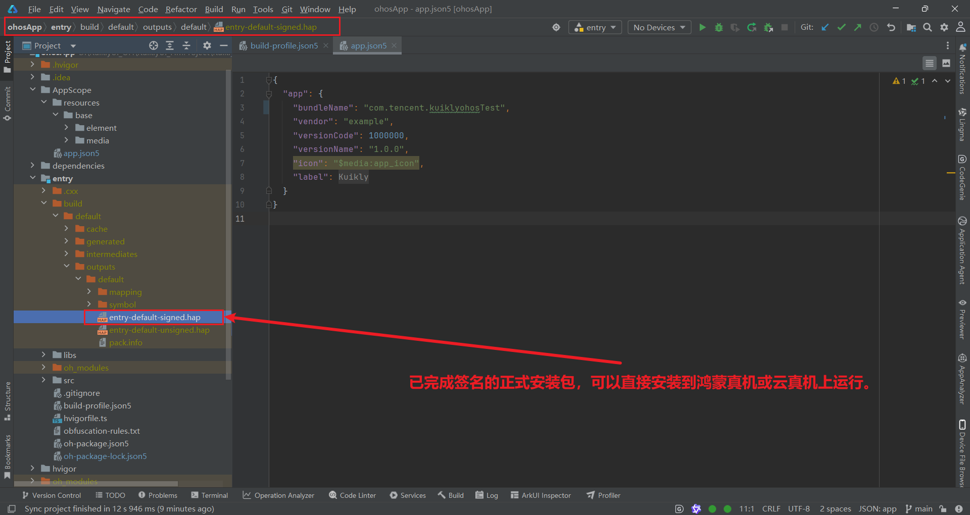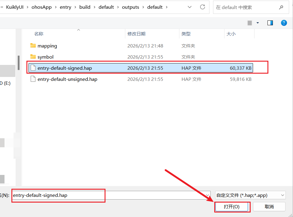 ohosApp/entry/build/default/outputs/default目录下找到entry-default-signed.hap文件,这就是带有合法签名的正式安装包,可直接安装到鸿蒙设备或云真机上运行。