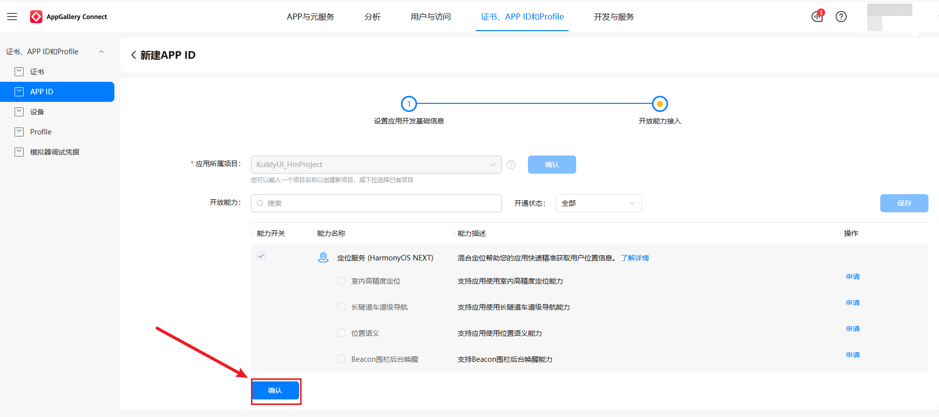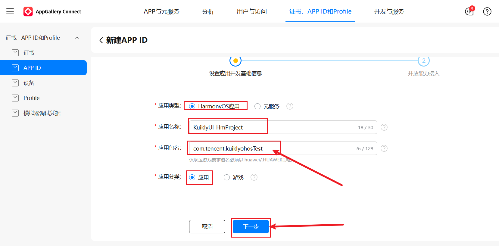应用,点击下一步→确认,完成 APP ID 创建。