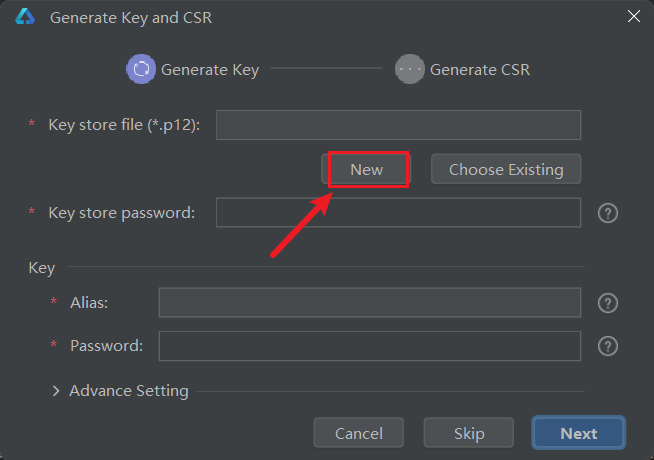 Key store file (*.p12)旁的New按钮,在项目根目录下创建一个名为p12file的文件夹,用于集中管理签名文件。