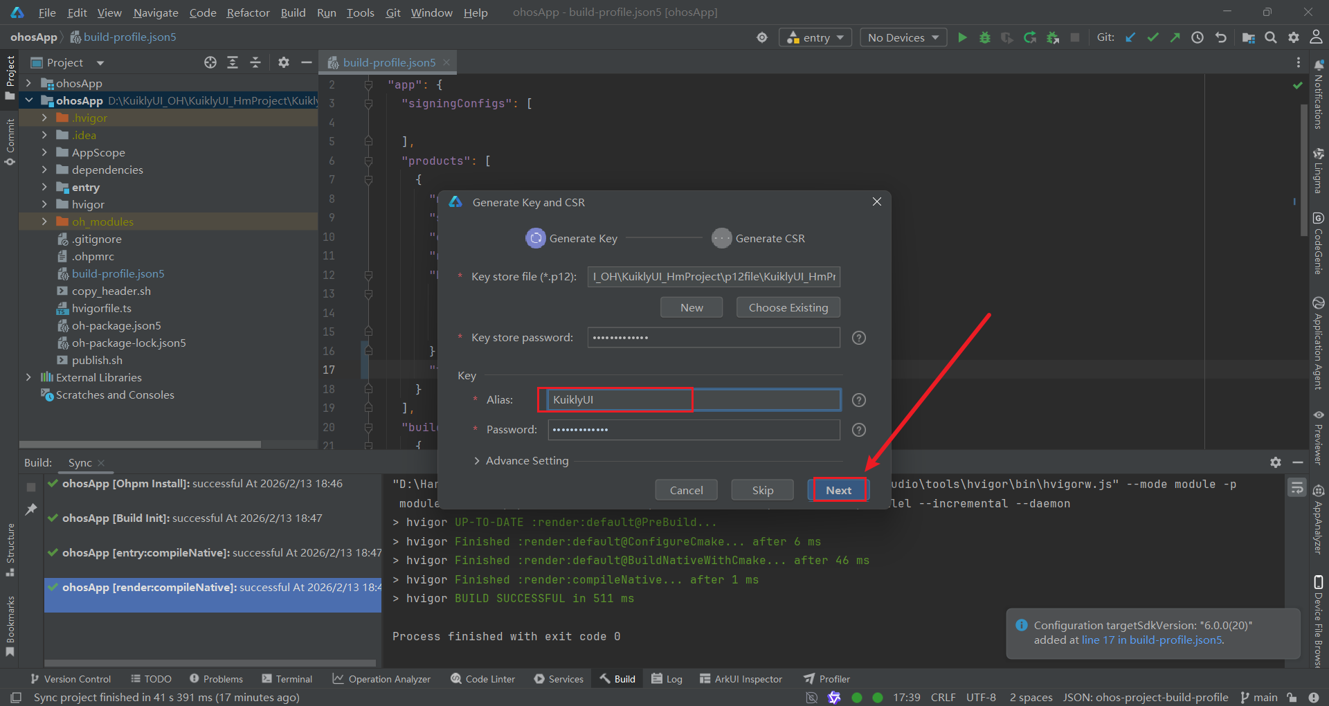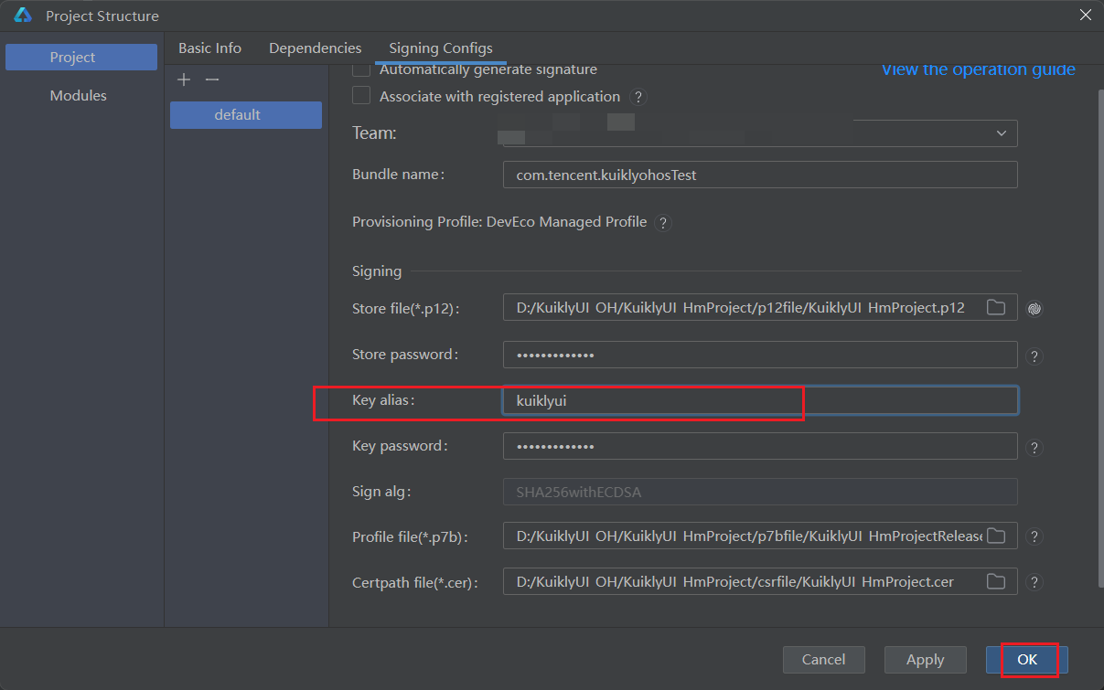 Key alias not found错误,可通过keytool -list -keystore KuiklyUI_HmProject.p12命令查看到真实别名(如kuiklyui),并在此处填写。 - Key password:输入之前设置的密钥密码。