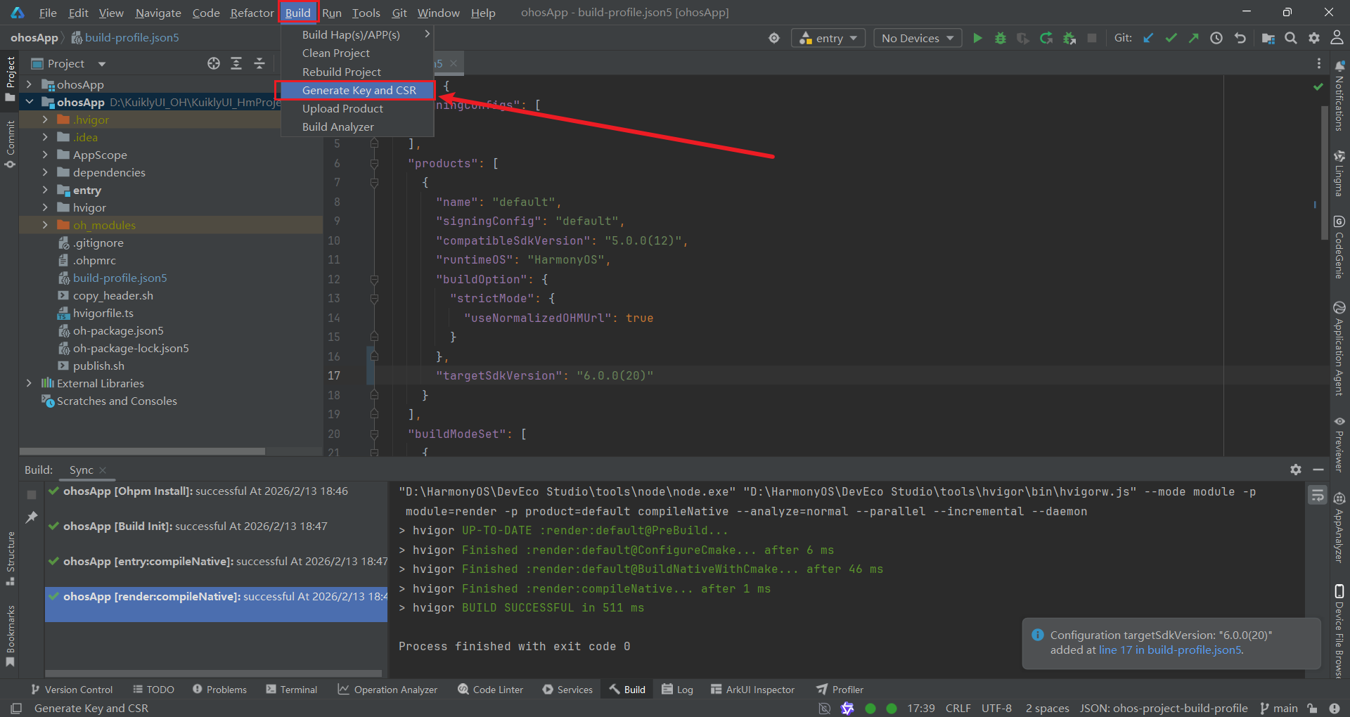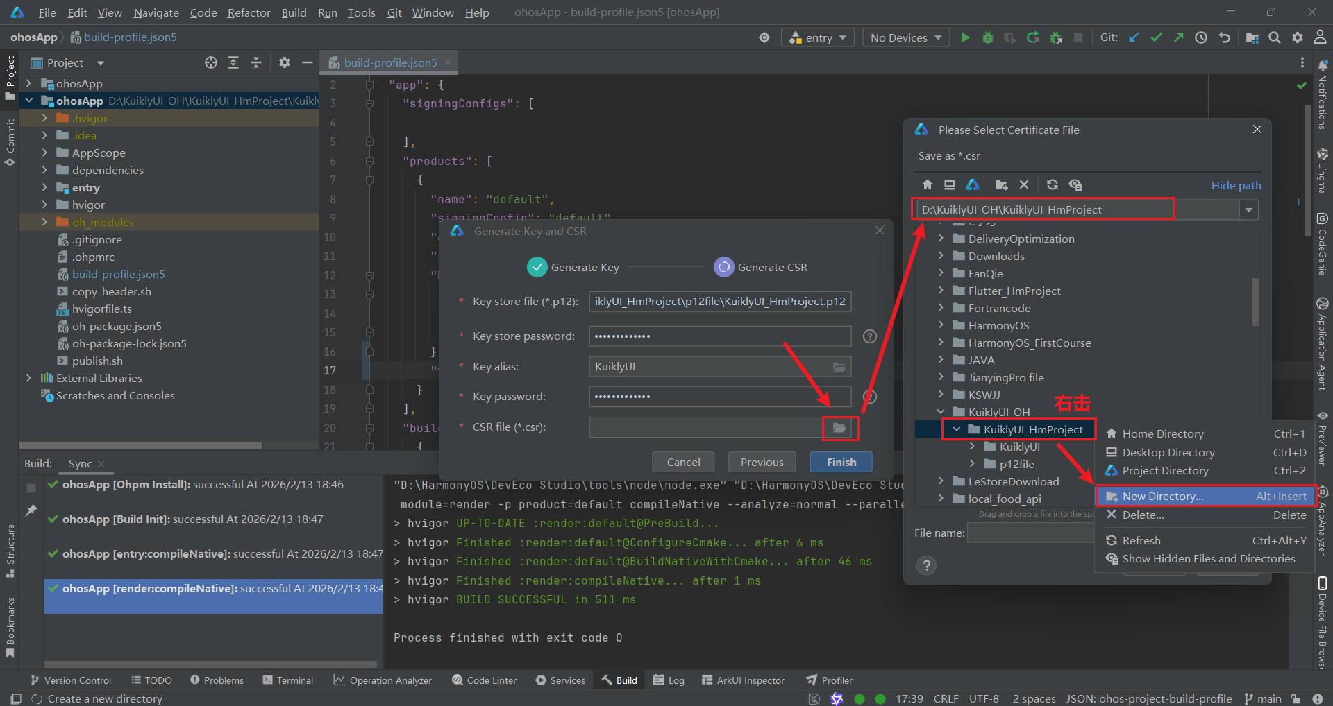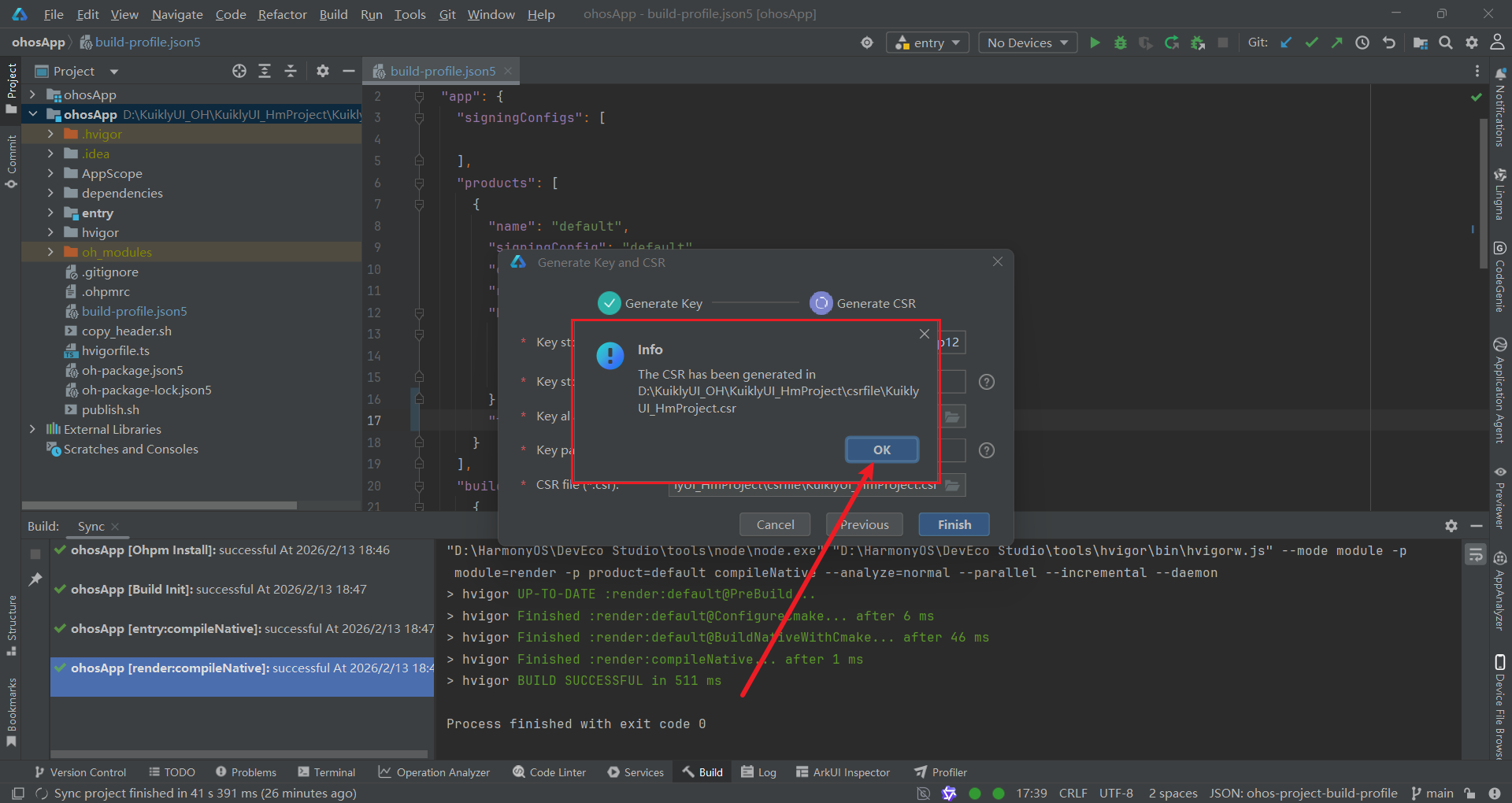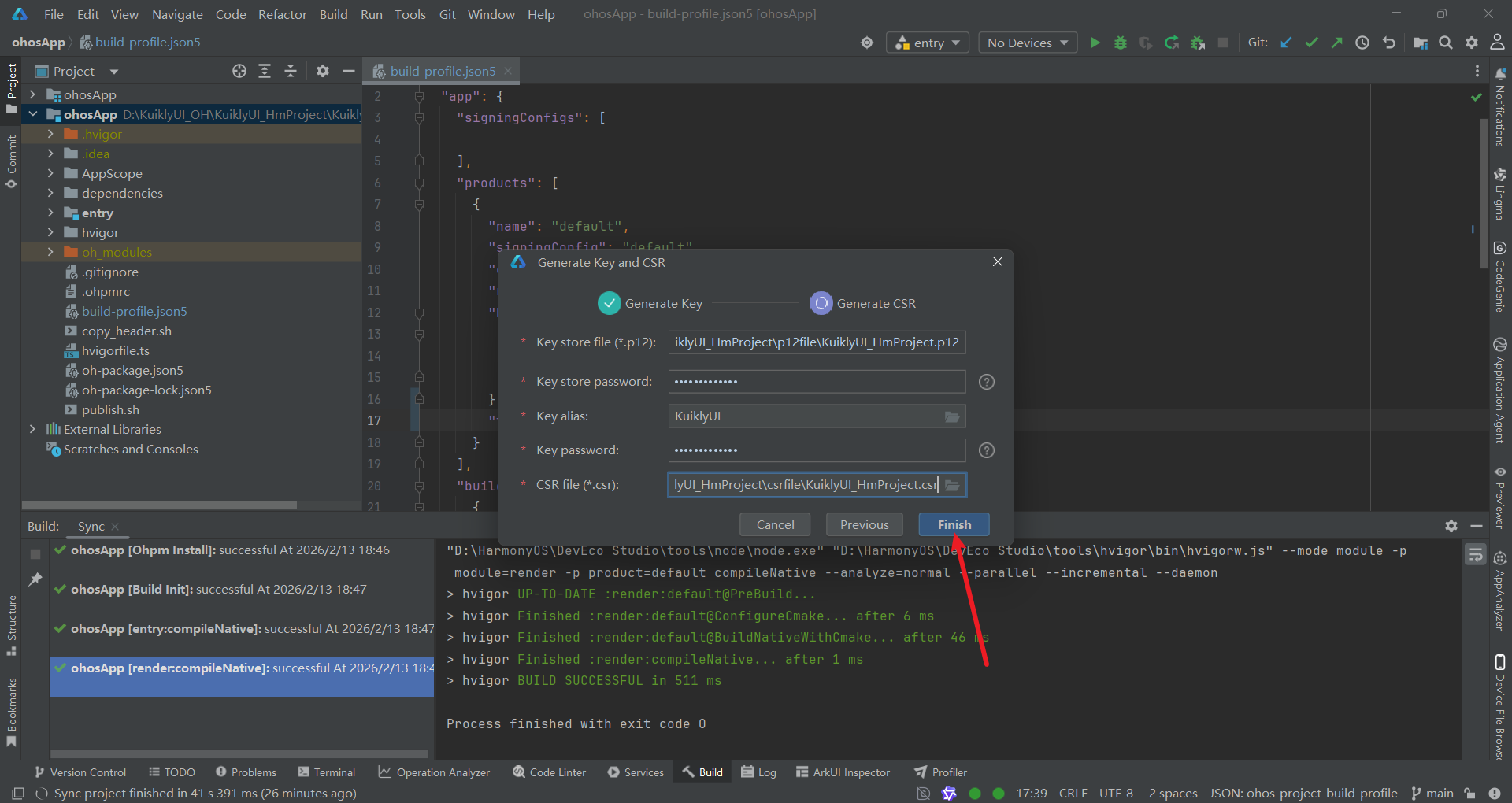 Finish,完成文件生成。此时,csrfile文件夹中将生成KuiklyUI_HmProject.csr文件。