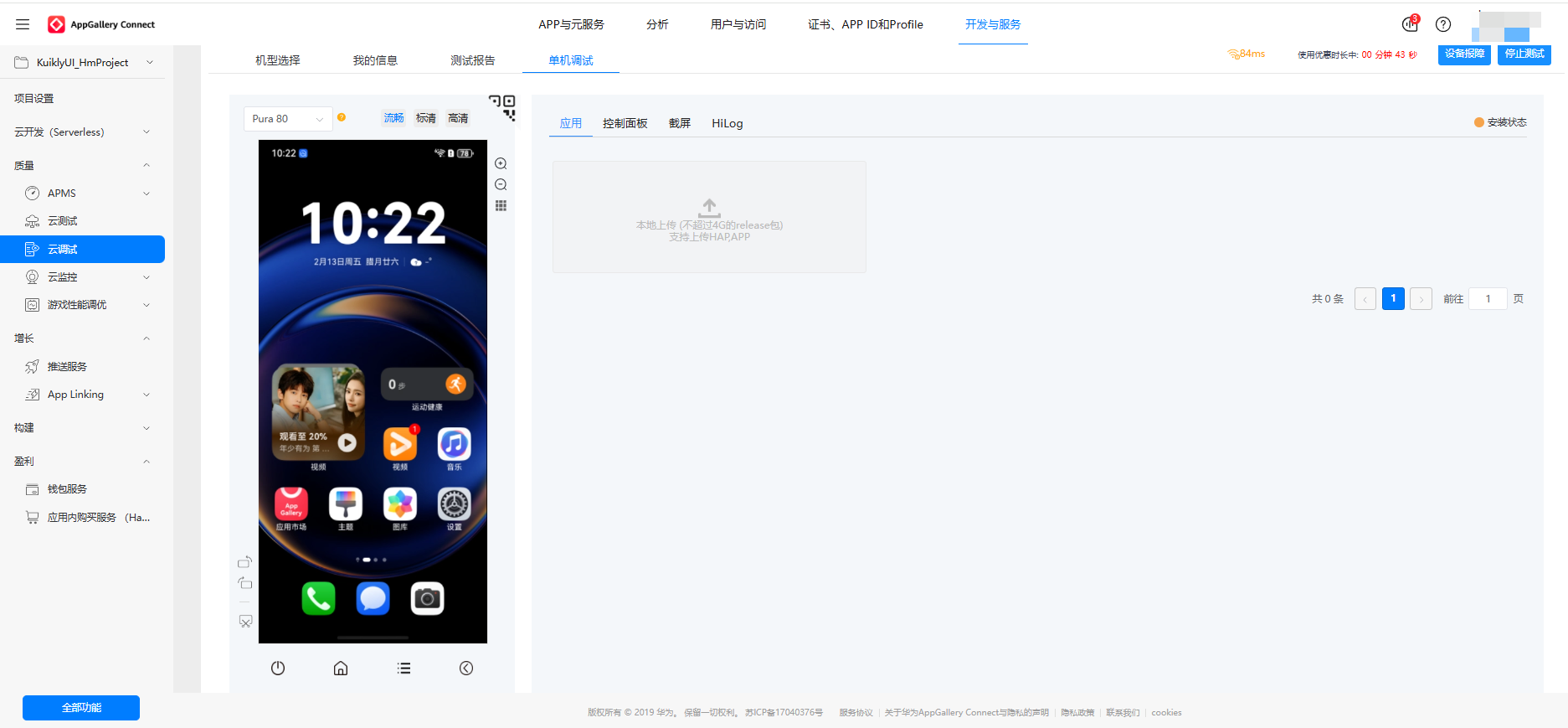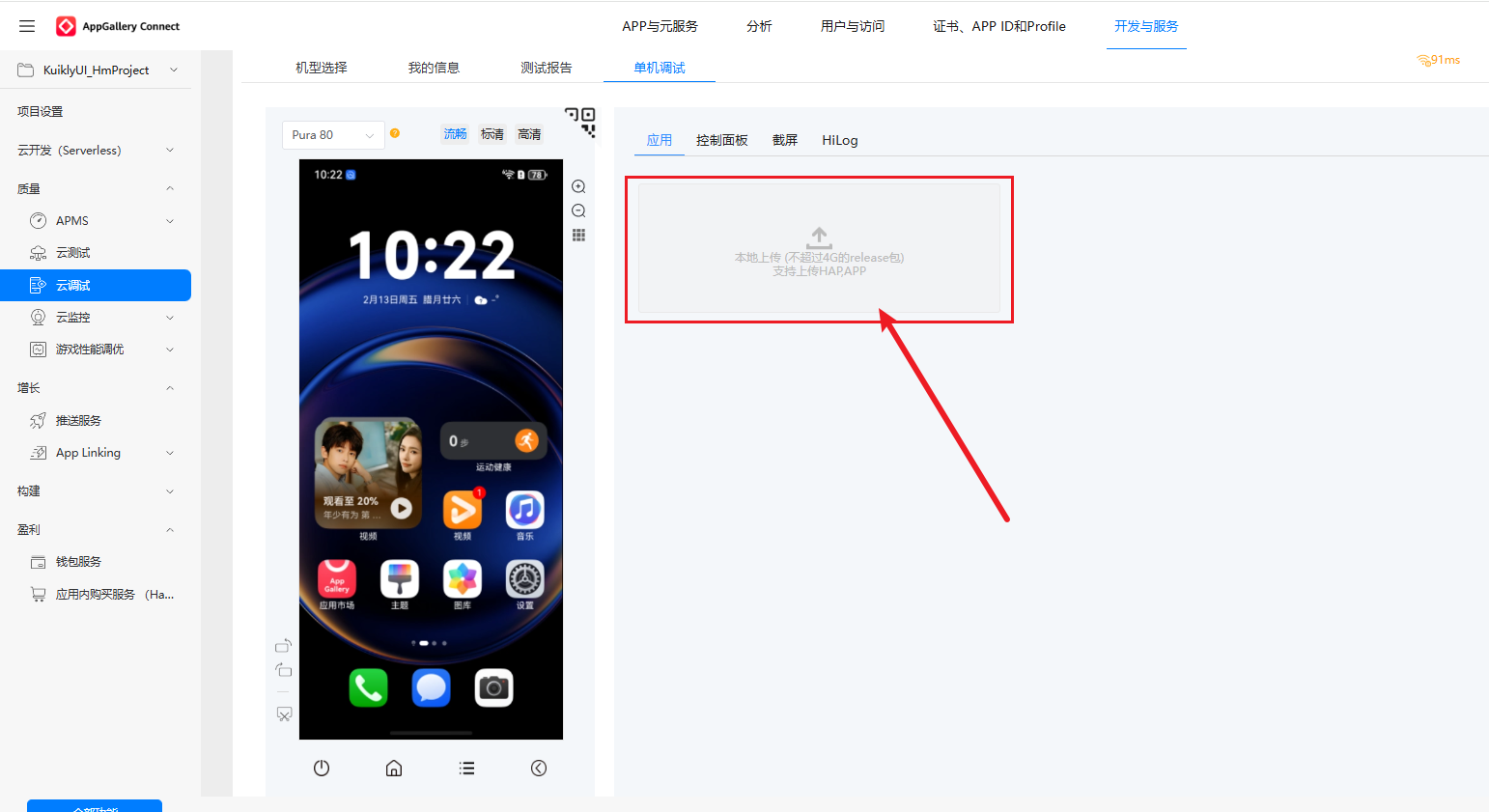 构建完成后,我们可以通过 AppGallery Connect 的云调试服务,将 Kuikly 应用部署到华为云真机上进行运行验证,确保应用在真实鸿蒙设备上的兼容性和功能完整性。
