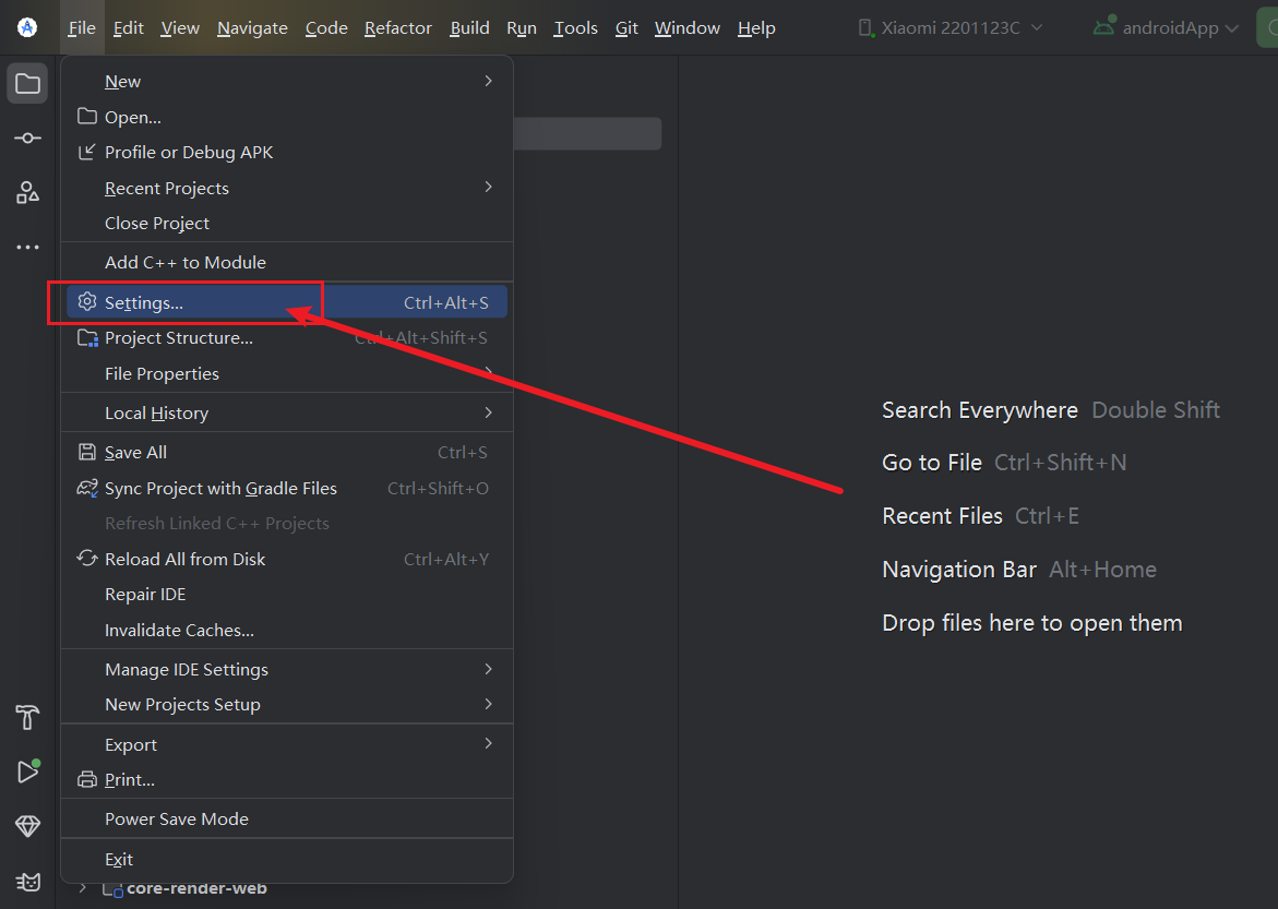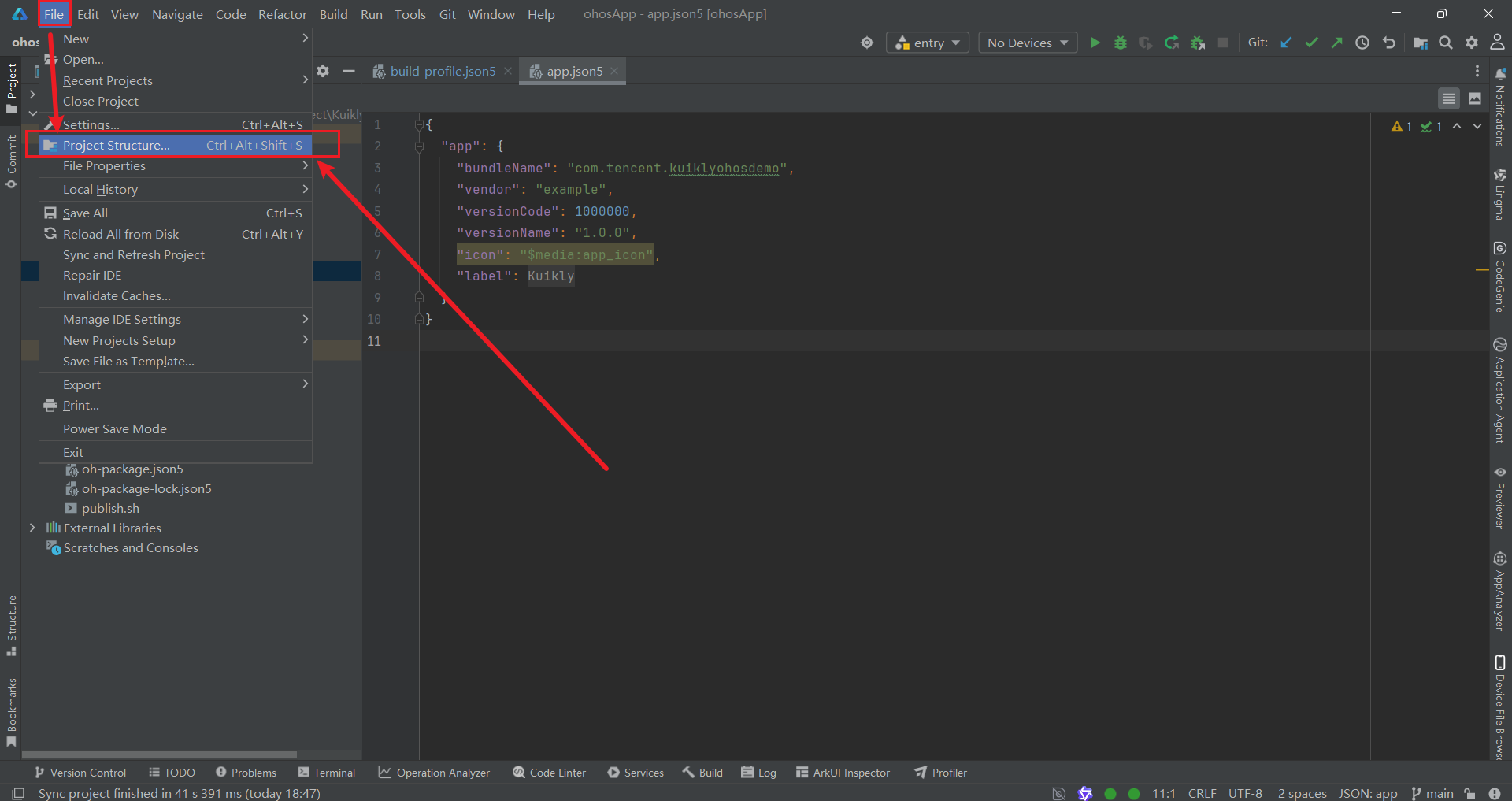 - 打开 DevEco Studio,在顶部菜单栏选择