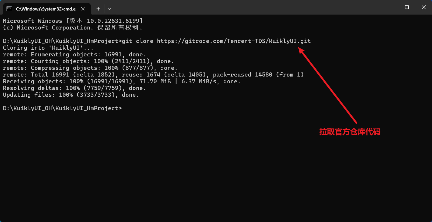 接下来,我们通过 Git 工具 / cmd命令打开命令提示符后从官方仓库克隆 KuiklyUI 的源代码。