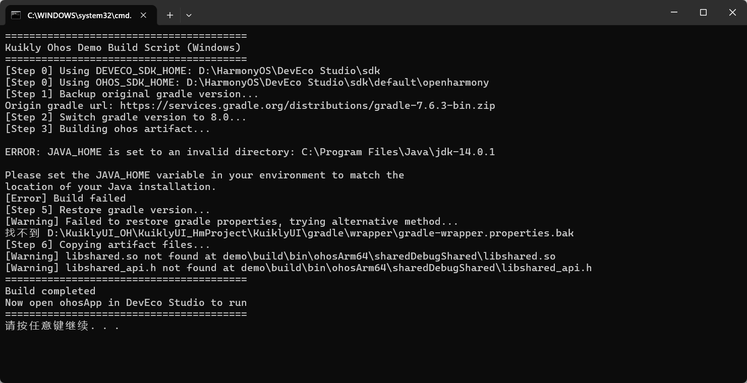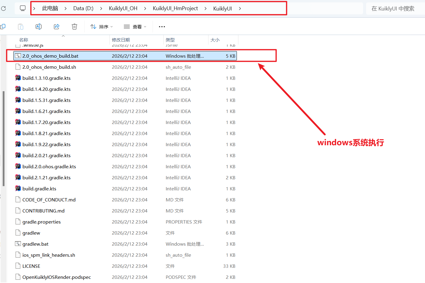 Kuikly 项目根目录提供了针对 Windows 平台的编译脚本 2.0_ohos_demo_build.bat,我们直接双击运行即可: