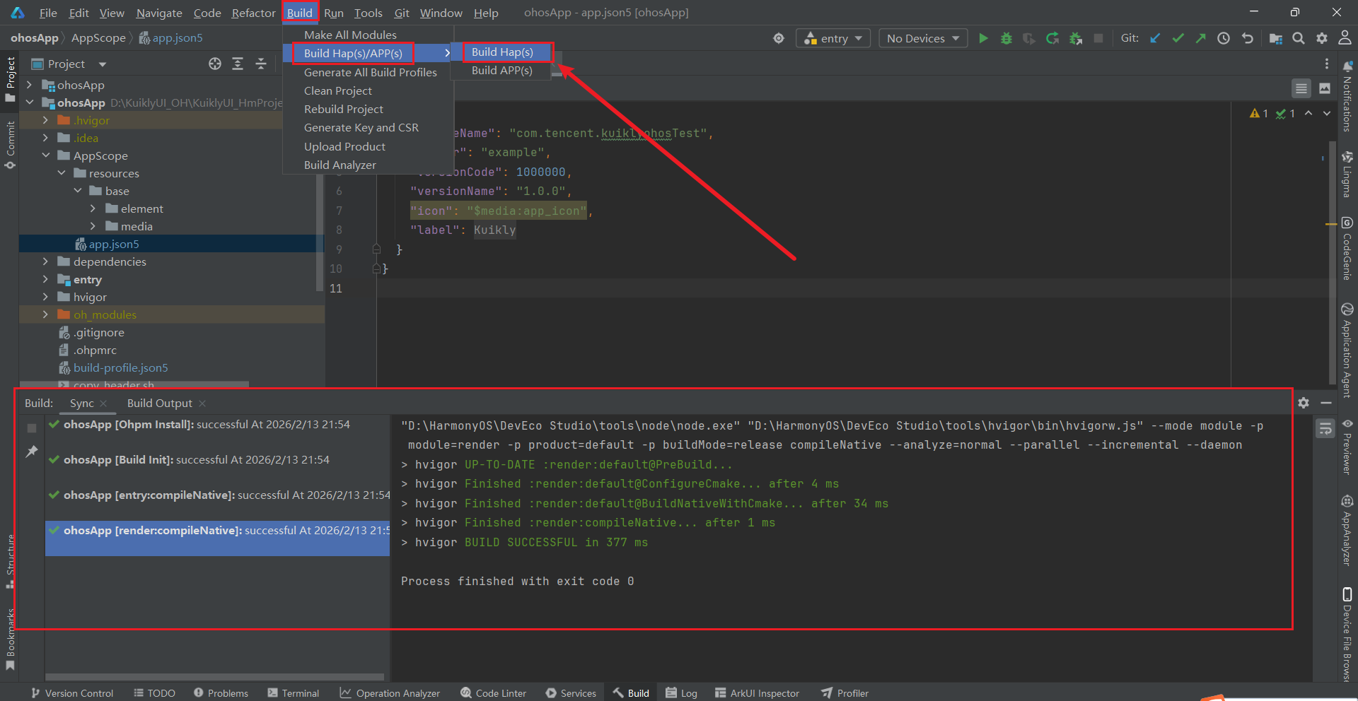 Build→Build Hap(s)/APP(s)→Build Hap(s),开始构建。