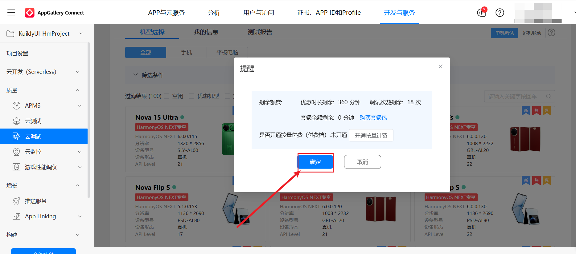 确定,启动云真机服务。