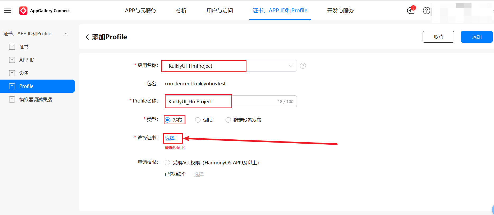选择证书,关联之前申请的KuiklyUI_HmProject发布证书。