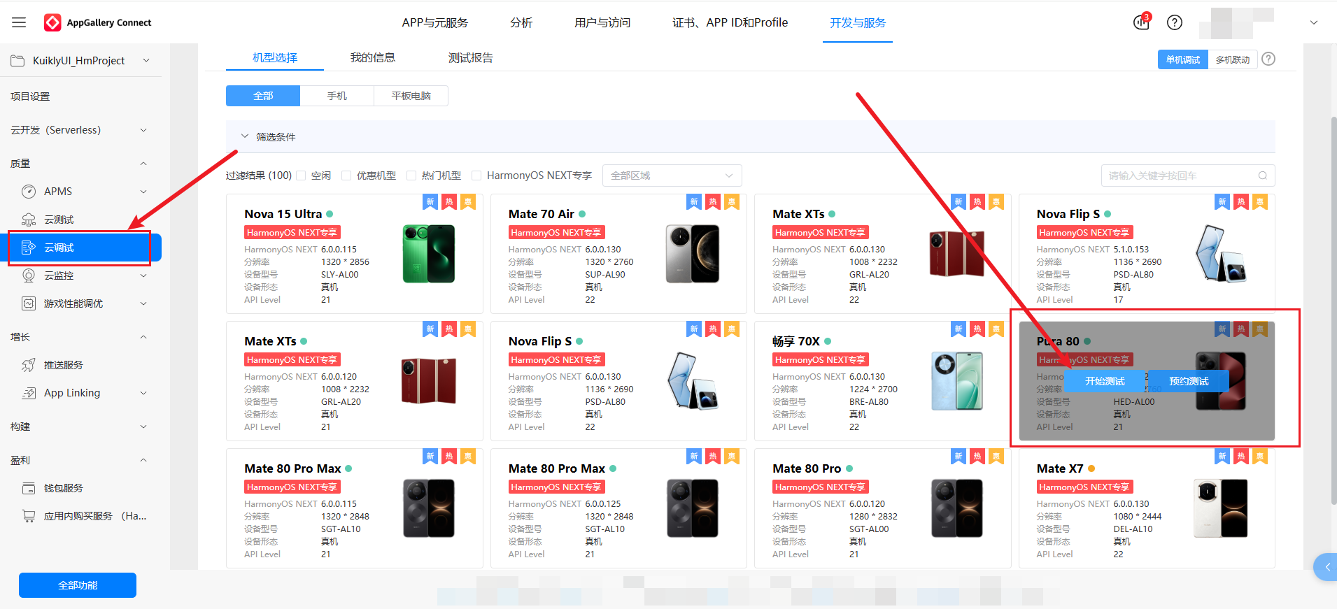 开发与服务→云调试。 - 在机型选择页面,可根据需求筛选设备(如 HarmonyOS NEXT 专享机型),选择一款空闲设备(如 Pura 80),点击