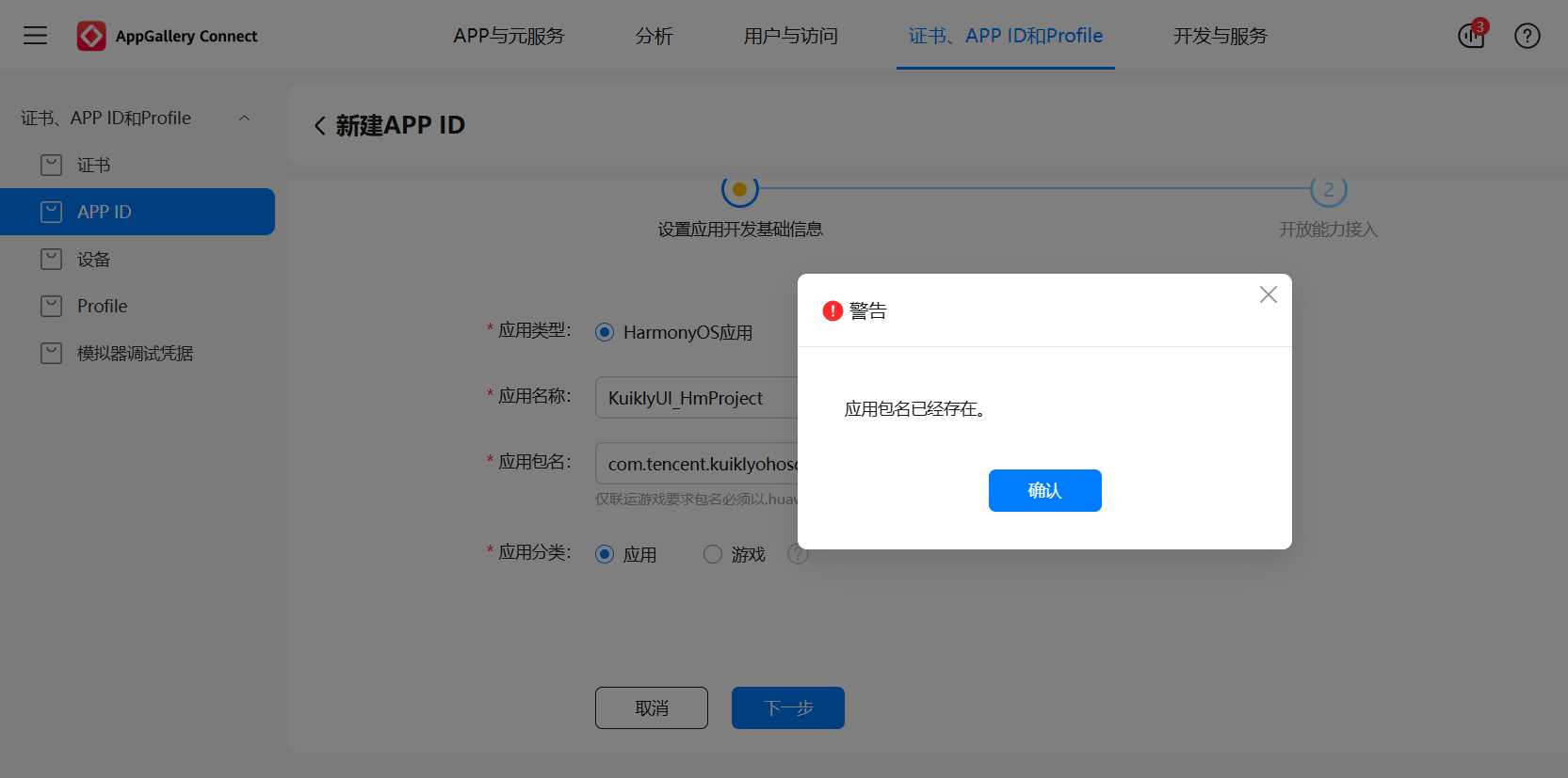 ⚠️ 注意:下面图片中出现了 "应用包名已经存在" 的警告提示,若包名已存在,需修改为唯一值,确保与项目配置一致,否则后续签名和部署将失败。