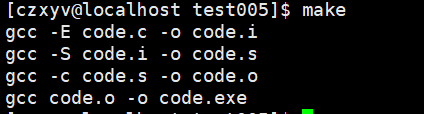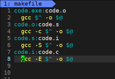makefile也可以通过上面这种形式来链式调用方法,make时会执行第一个方法,发现缺少code.o文件,然后他会在后面的列表中找是否有生成code.o文件的方法,如果有,就执行,以此类推。