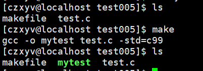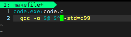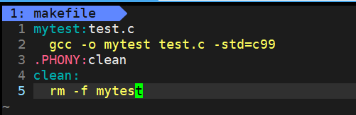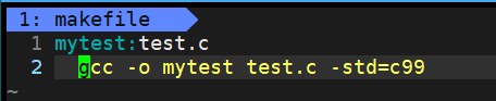 gcc -o mytest test.c -std=c99,是依赖方法,依赖方法前面必须要有一个缩进(Tab)。 - 第三行