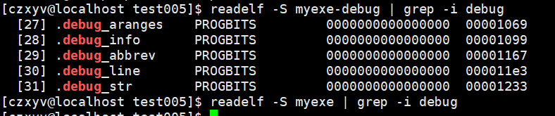 那么debug模式下加了什么东西呢?我们可以通过readelf -S 可执行程序来查看可执行程序的一些信息。